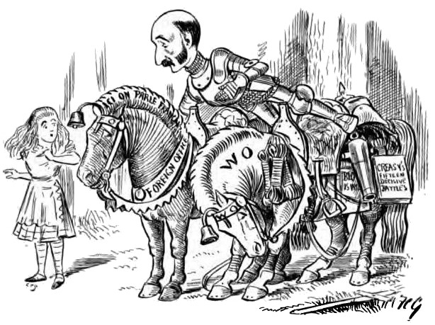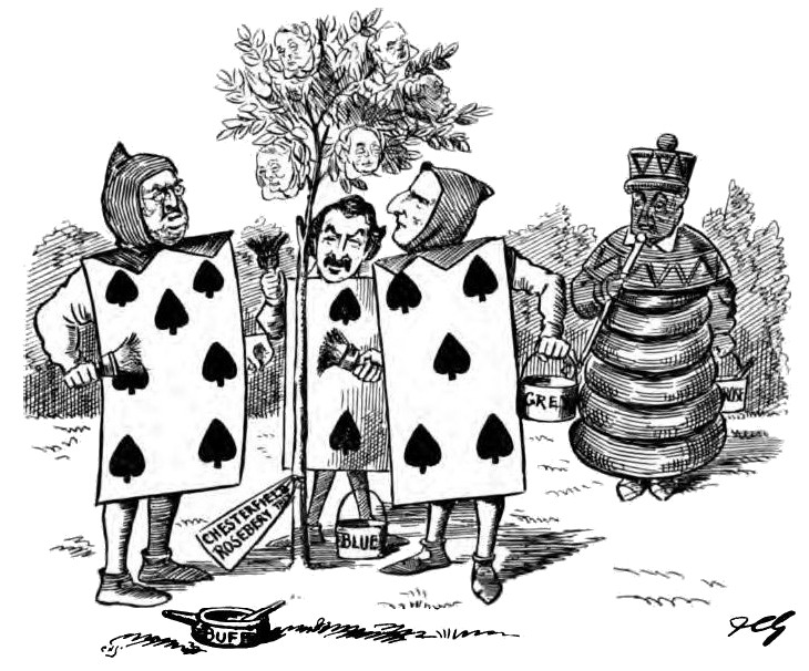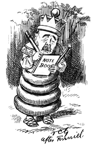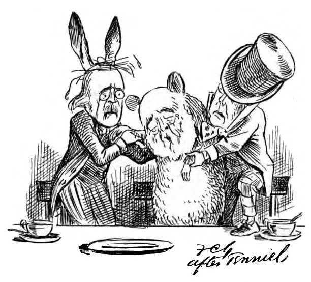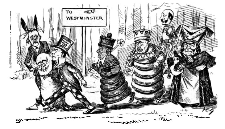 With apologies to Sir John Tenniel and to everybody else concerned, including Messrs. Macmillan and Co., Limited, to whose courtesy we are indebted for permission to publish these political applications of the immortal adventures of Lewis Carroll’s Alice.
