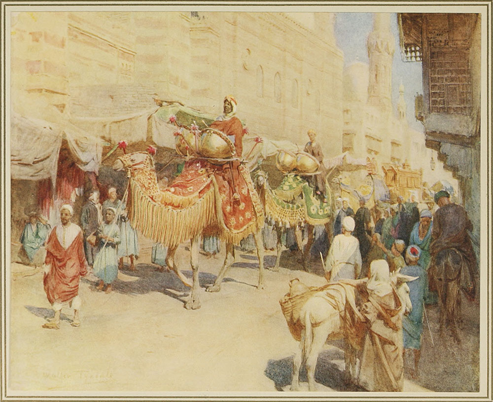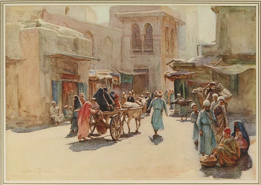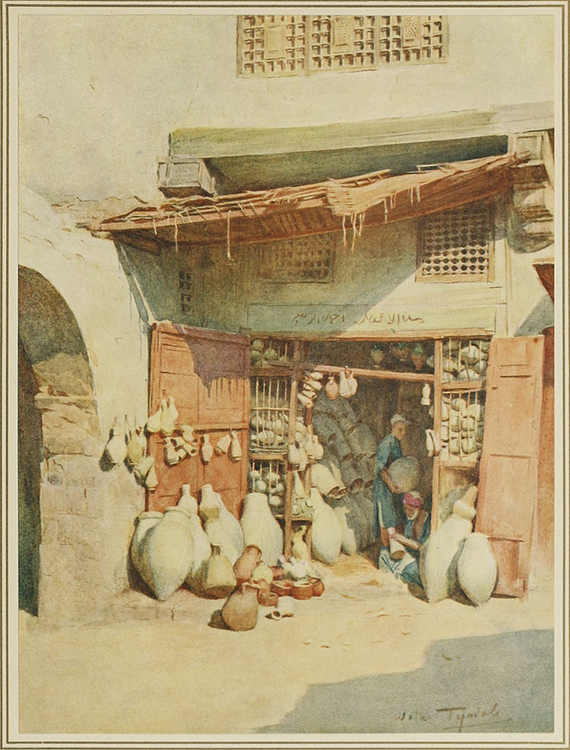 The general impression is one of light, colour, noise and movement. The detail is full of human as well as pictorial interest. Various combinations of colour—some beautiful, some inharmonious—leave ample scope to the painter to arrange his scheme. A pile of oranges and lemons, with the black and deep purple dress of the fellaha saleswoman, make a striking note in the foreground; the stacks of pitchers brought down from Balliana, in Upper Egypt, give a variety in buffs and greys, and the blue garments of the buyers are sufficiently faded not to contrast too violently. It is also a great study of types and characters. The noisy Cairene is chaffering with the quieter Shami from far Damascus for some pomegranates which are heaped before him; the Maghraby hawks a bundle of yellow slippers; Jew and Greek are trying to outdo each other in a deal over a spavined horse.