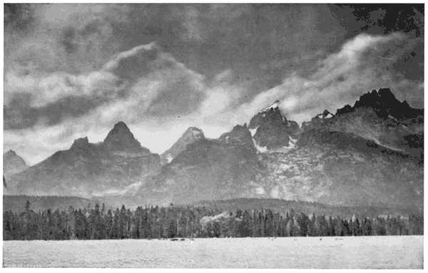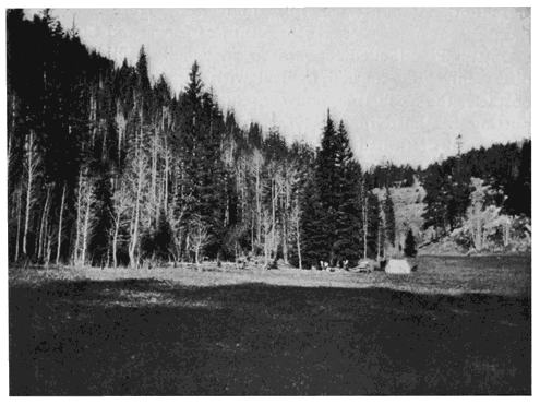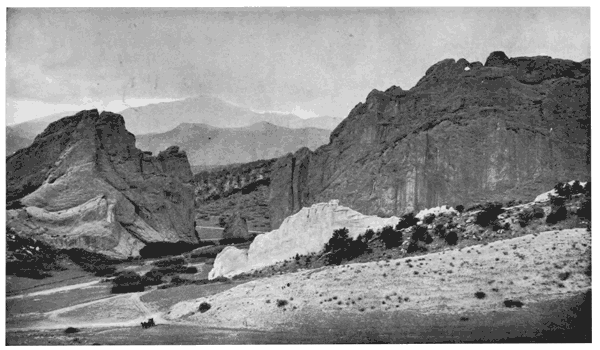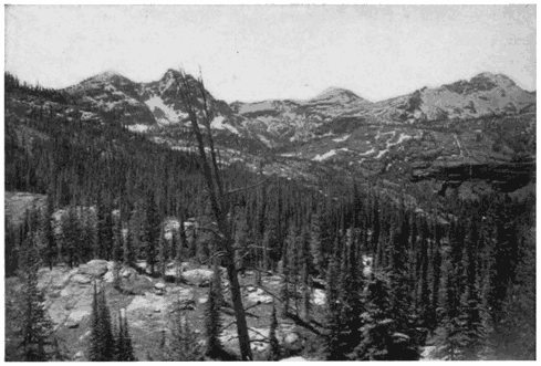 | The point of view is on Trinchera Creek looking north from an altitude of about 8000 feet. To the left is the San Luis Valley through which flows the Rio Grande, and to the right are the two high passes known as Veta and Sangre de Cristo. The Sierra Blanca forms the southern end of the Sangre de Cristo Range and was one of the great landmarks of the Wilderness. | ||