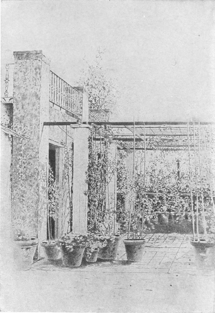 The monsignore’s red rose on the terrace looked so lonely that I went last Wednesday to Rag Fair in the Campo dei Fiori and bought a pink ivy geranium, some pansies, and a white carnation to keep it company; they were absurdly cheap; flowers are a necessity here, not a luxury. I also bought a sack of earth, some flower-pots, and a watering-can. I got up at dawn the next morning and potted my plants; hard work! When J. came up at seven o’clock for coffee, there they stood in a row at the end of the terrace. It was a real surprise; I was very proud, till I found that he had to{11} do the work all over again, just because I had not put anything in the bottom of the flower-pots to keep the earth from running out when they are watered! J. says we must have more, many more, plants. Sunday he was pottering about all day with the plumber. We are to have another quarto of water laid on, the pipes carried to the upper terrace, and a vast Florentine flower-pot—you know the kind, terra-cotta—for the receiver. Some day we mean to have a marble sarcophagus in its place. They took the beautiful long zinc bath-tub for the tank; this was a blow, but Pompilia and Filomena found it too convenient! Every one who has seen it on the upper terrace says, “Do you take your bath up here?” It is not easy to laugh at this inevitable joke; I wait for it now from each new visitor, and feel relieved to get it over.
