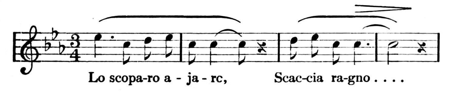Signor Augusto Rotoli has written out for me the notes of several of the cries. In the Acetosa score he has indicated the blows of the driver, the kicks of the donkey, and finally the patter-patter of the poor little beastie’s hoofs over the rough paving-stones of the Borgo Nuovo: