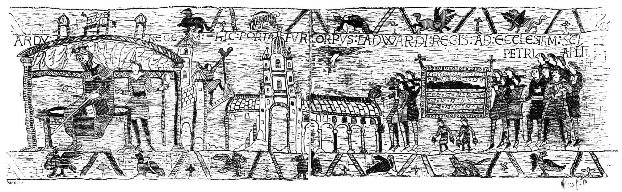 It is impossible to ascertain what, and of what kind, were the buildings of Edward the Confessor: tradition always assigned to him the Painted Chamber and the group of buildings which survived to the year 1835. Let us, however, consider what were the actual requirements of a Royal Palace under the Plantagenets. It will be seen very soon that this group of buildings could have formed only a very small portion of the whole Palace. It will also be found that the Palace grows in the mind as we consider it. At first the Court was itinerant. Edward the Confessor was constantly traveling into different parts of his realm: he kept every Christmas, except his last, at Gloucester; his Easter he kept at Winchester; he resided a good deal at Westminster; we hear of him at Worcester; at Sandwich; he hunted in Wiltshire. Henry II., whose actual itinerary has been recovered and published, seldom remained more than a few days in one place; he was sometimes in France for three or four years at a time; during the whole of his long reign he was only in Westminster on seventeen occasions, and then often for a night or two only. Until the Tudors began a stationary Court, the kings of England traveled a great deal, and, in case of war, always went out with the army. Whether they traveled or whether they{41} stayed in one place, there was always with them a following greater than that of any baron. Warwick rode into London with seven hundred knights and men at arms; that was but a slender force compared with the company which rode after the king. Cnut, who perhaps began this first standing army, had three thousand “hus-carles”; Richard II. had four thousand archers always with him.