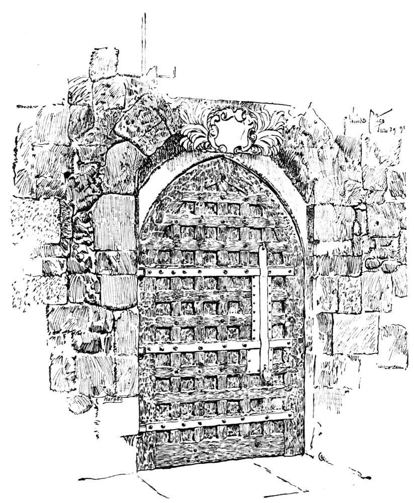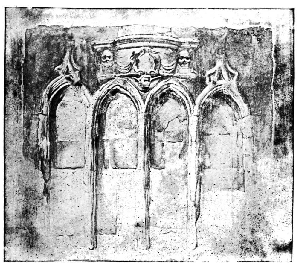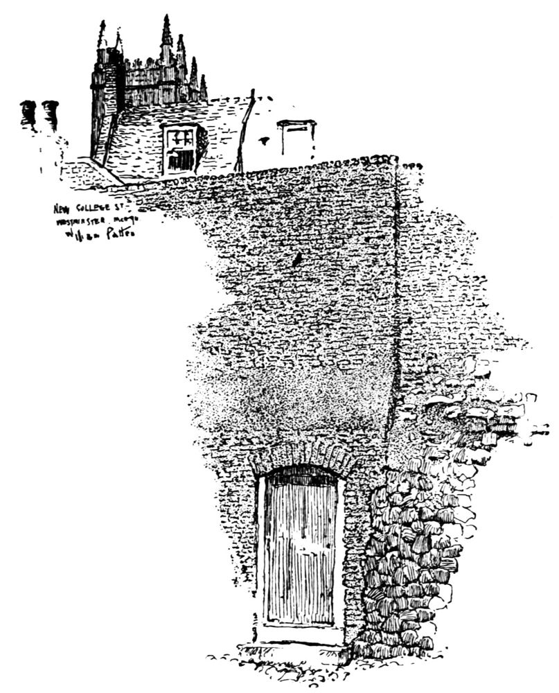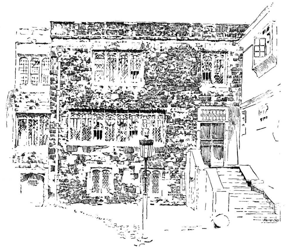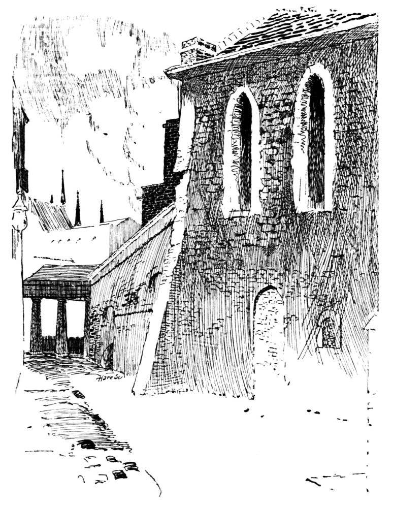It was the first duty of the mediæval builder to provide a wall of defense. This was done at West{47}minster. The wall, as indicated on the plan, entirely surrounded the Palace; it was provided with a water gate at the King’s Bridge or King’s Stairs; a postern at the Queen’s Stairs; a gate leading into the Abbey precinct east of St. Margaret’s Church; a subway by which the king could enter the Abbey, at Poet’s Corner; and a gate opposite the Great Hall leading into the Wool Staple.