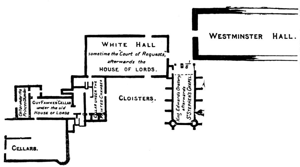The hall adjoining the old House of Lords formed, with the Painted Chamber and the Court of Requests, Edward the Confessor’s living rooms. Under the House of Lords was the King’s kitchen, afterward the cellar where Guy Fawkes and his friends placed the barrels of gunpowder. After the Lords removed to the Court of Requests this room was called the Royal Gallery.