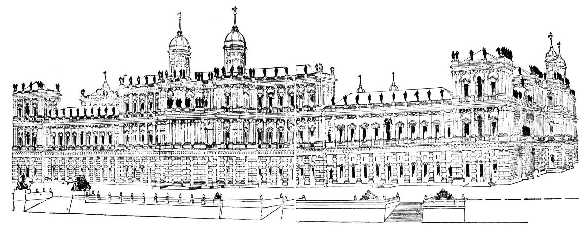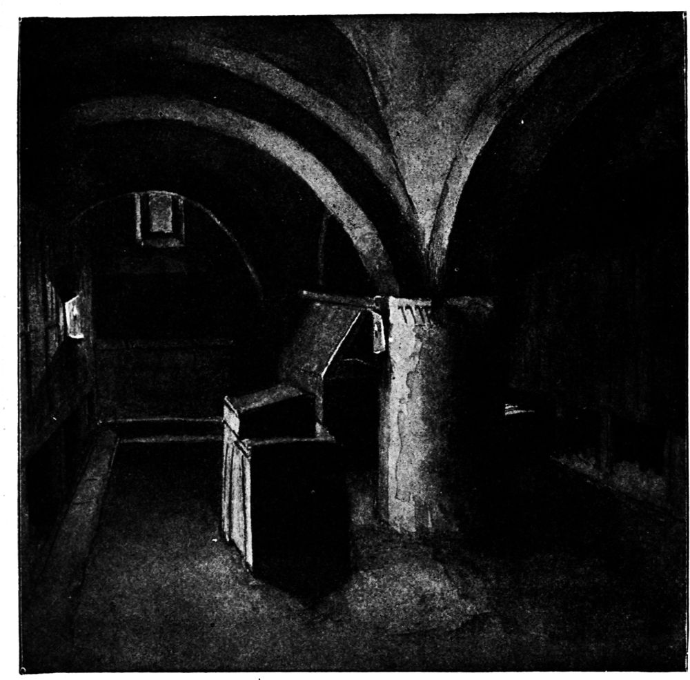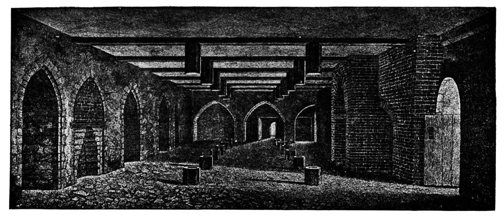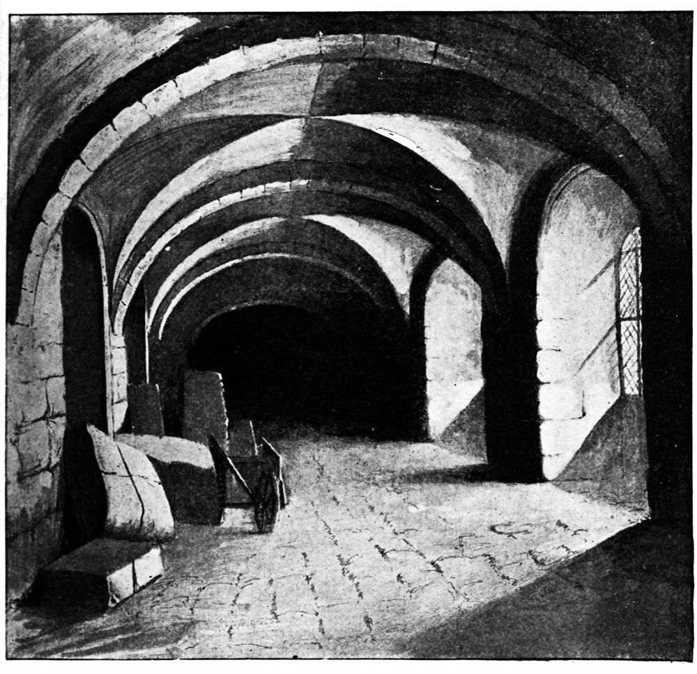What kind of quarters were given to the king’s courtiers and his army and his servants? This is a question to which one can give no satisfactory answer. We hear of many rooms and buildings, but there does not exist any description or plan of the palace as it was. It must certainly have contained a vast number of buildings for the accommodation of so many thousands. The fact that these buildings existed was proved after the fire of 1834, when a most extensive range of cellars and vaults was found to exist under the burned buildings round St. Stephen’s. The old buildings had long before been destroyed and modern houses had taken their places; but the vaults and cellars remained, showing by their strength and solidity the importance of the halls and chambers that had been built upon them.