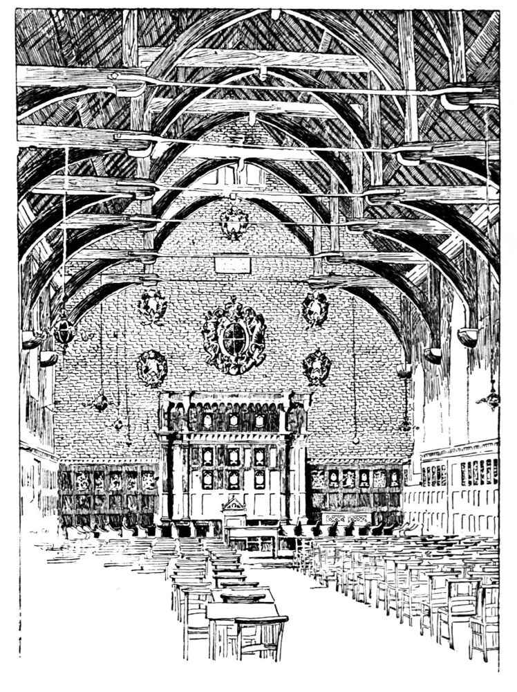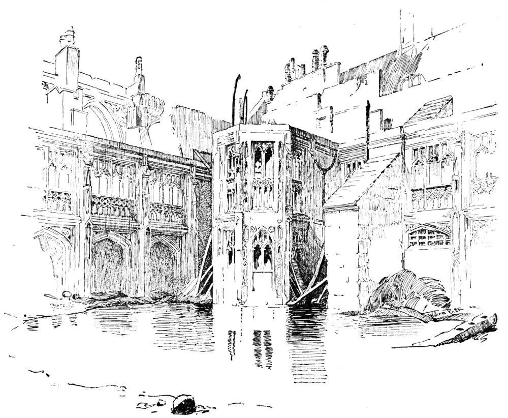 The kings of England held their Court in the Old Palace, the Palace of Westminster, for five hundred years. Of all the buildings which formed that Palace, there remain at this day nothing but a Hall, greatly altered, a Crypt, and a single Tower. Sixty years ago, before the last of the many fires which attacked the Palace, there was left, much disfigured, a single group of buildings which formerly contained the heart of the Palace, the king’s House. This group, however, was so much shut in and surrounded with modern houses, courts, offices, taverns, and stores, that the ancient parts could be with difficulty detached. Fortunately this task was accomplished before the fire: one can therefore restore one part, at least, of the Palace.