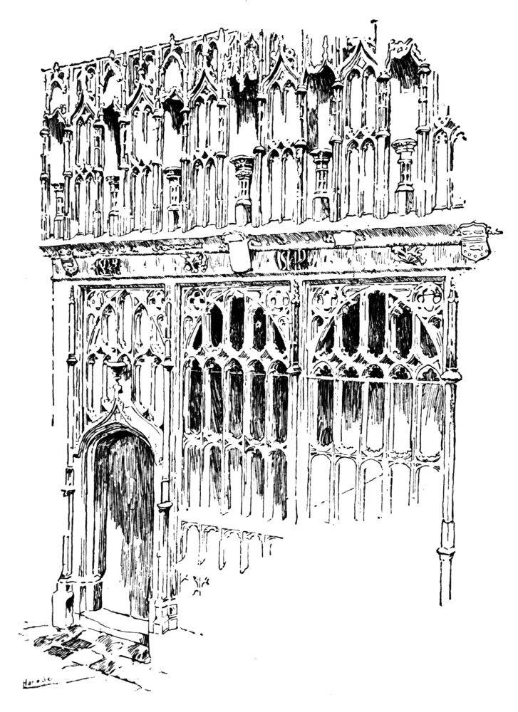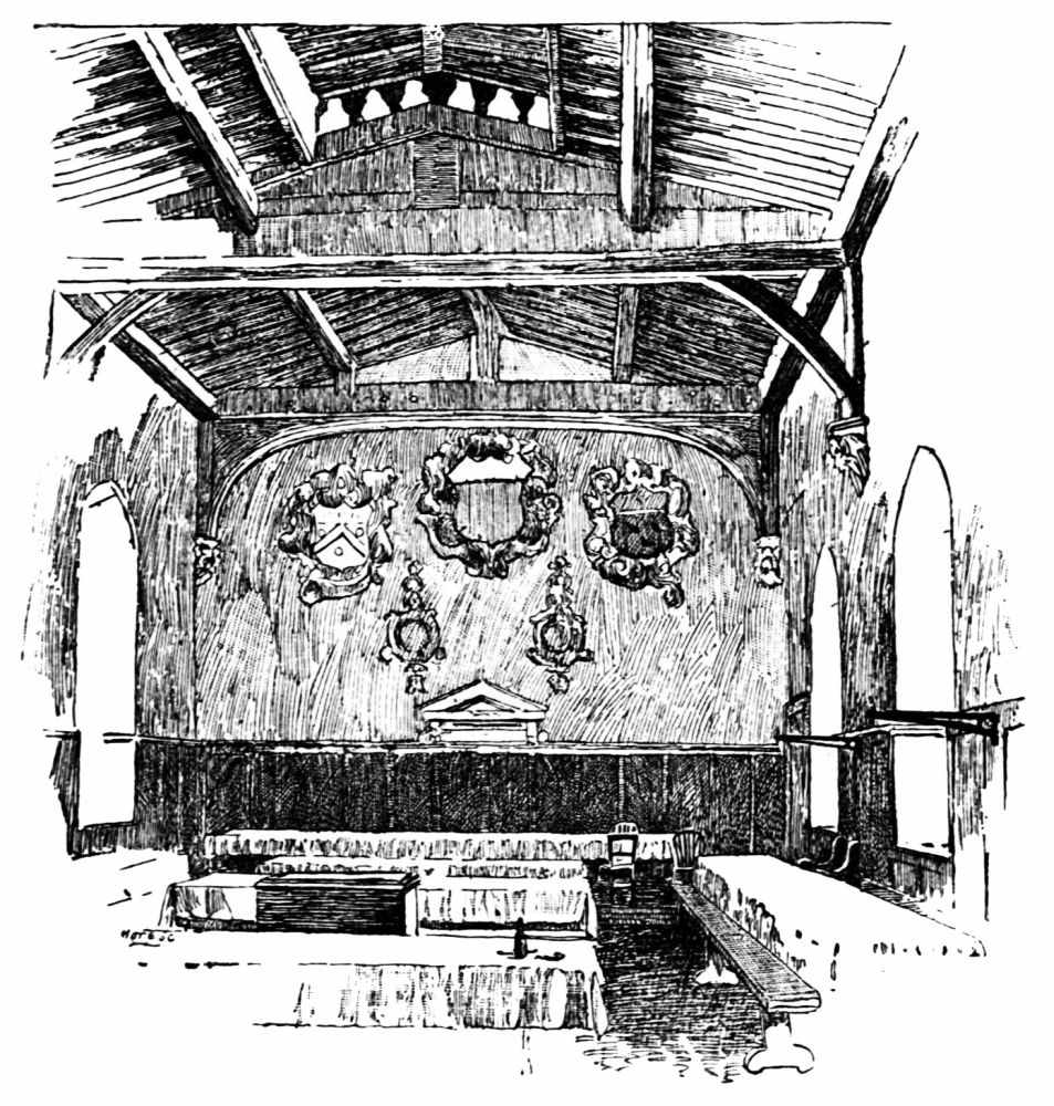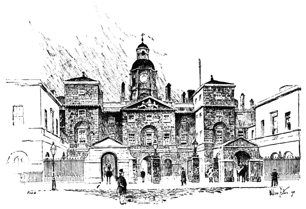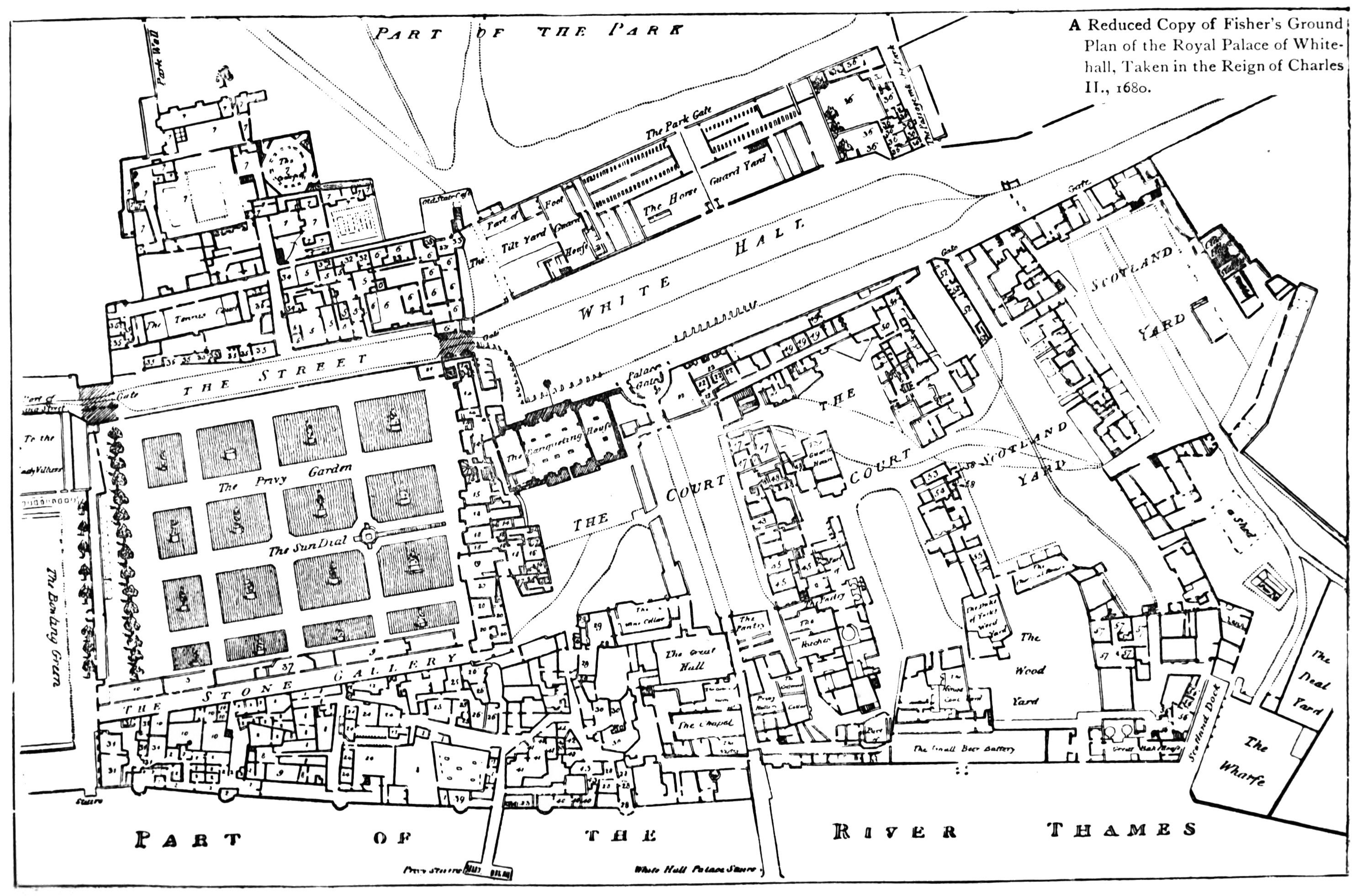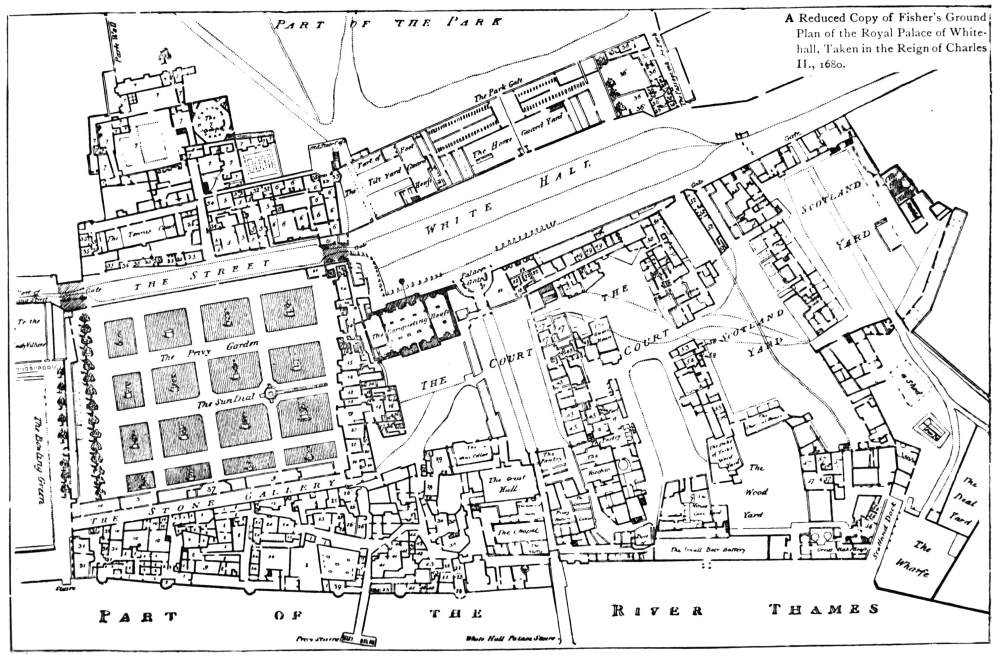 Thus fortified, the Palace assumed something of the{48} usual plan of a Norman castle. The Outer Bailly was represented by the New Palace Yard, with its Clock Tower and place for martial exercises, ridings, and tournaments. Westminster Hall faced the Outer Bailly; to right and to left, to east and to west, stood buildings; on the south were other buildings which inclosed the Inner Bailly, now Old Palace Yard; south of these were gardens and stables with less important houses, offices, and barracks. The great mass of the Palace buildings was between Westminster Hall and the river.