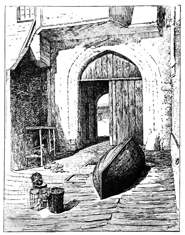 In other words, this wild and desolate spot, chosen, we are told, as a fitting site for a monastery because of its remoteness and its seclusion, was, long before a monastery was built here, the scene of a continual procession of those who journeyed south and those who journeyed north. It was a halting-and resting-place for a stream of travelers who never stopped all the year around. By way of Thorney passed the mer{16}chants, with their hides bestowed upon their packhorses, going to embark them at Dover: London had not yet gathered in all the trade of the country. By way of Thorney they drove the long strings of slaves to be sold in Gaul. By way of Thorney passed the legions on their way north; craftsmen, traders, mimes, actors, musicians, dancers, jugglers, on their way to the towns of Glevum, Corinium, Eboracum, and the rest. Always, day after day, even night after night, there was the clamor of those who came and those who went: such a clamor as used to belong, for instance, to the courtyard of an old-fashioned inn, in and out of which there lumbered the loaded wagon, grinding heavily over the stones; the stage-coach, the post-chaise, the merchant’s rider on his nag—all with noise. The Isle of Bramble was like that courtyard: outside the Abbey it was a great inn, a halting-place, a bustling, noisy, frequented place; the center, before London, the mart of Britannia; no “Thebaid” at all; no quiet, secluded, desolate place, but the center of the traffic of the whole island. And it remained a busy place long after London Bridge was built, long after the Port of London had swallowed up all the other ports in the country. When the river, by means of embankments, was forced into narrower and deeper channels, the ford disappeared.