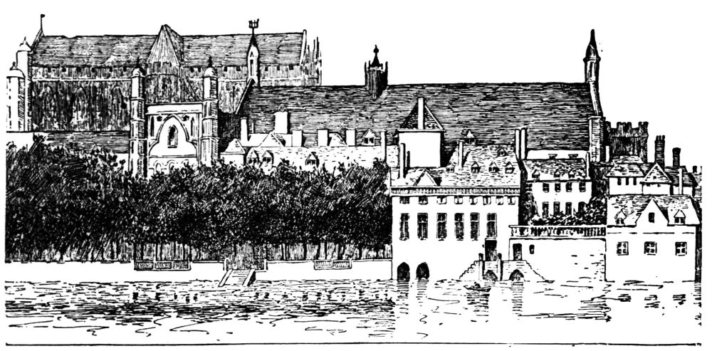 It has been remarked that antiquarians are prone to fall into the incurable vice of looking at the past through the wrong end of the telescope. This comes from constantly endeavoring to reconstruct the past out of an insufficient number of fragments. Of course the result is that everything is reduced in size. Thus, many antiquarians, being afflicted with this disease, have found themselves unable to see anything but a collection of miserable hovels in that London of the fourteenth century which was a city of nobles’ palaces, merchants’ stately houses, splendid churches, monastic buildings, beautiful and lofty, side by side with warehouses, wharves, ships riding at anchor, crowded streets, and rich shops. No antiquary, however, is wrong in showing that Westminster was, at this time, nothing more than a City—as yet not called a City—gathered round the Church and the Court. To those who journeyed thither from London by the river highway, a line of noble houses faced the river, each with its stairs, its barges, and its water gate. Thus, taking boat at Queenhithe, the traveler passed, among others, Baynard’s Castle, Blackfriars’ Abbey, Bridewell Palace, Whitefriars, the Temple, Durham House, the Savoy, York House, before he reached the King’s Stairs at Westminster. At the back of these houses, where is{40} now Fleet Street and the Strand, there were no houses in the fourteenth century, except just outside Ludgate. As late as 1543, according to the map of Anthony van den Wyngreede, the houses of Westminster were all gathered together in that little triangle opposite Westminster Hall, whose northern boundary was the stream running down Gardener’s Lane and cutting off Thorney. All beyond was open country lying in fields and meadows.