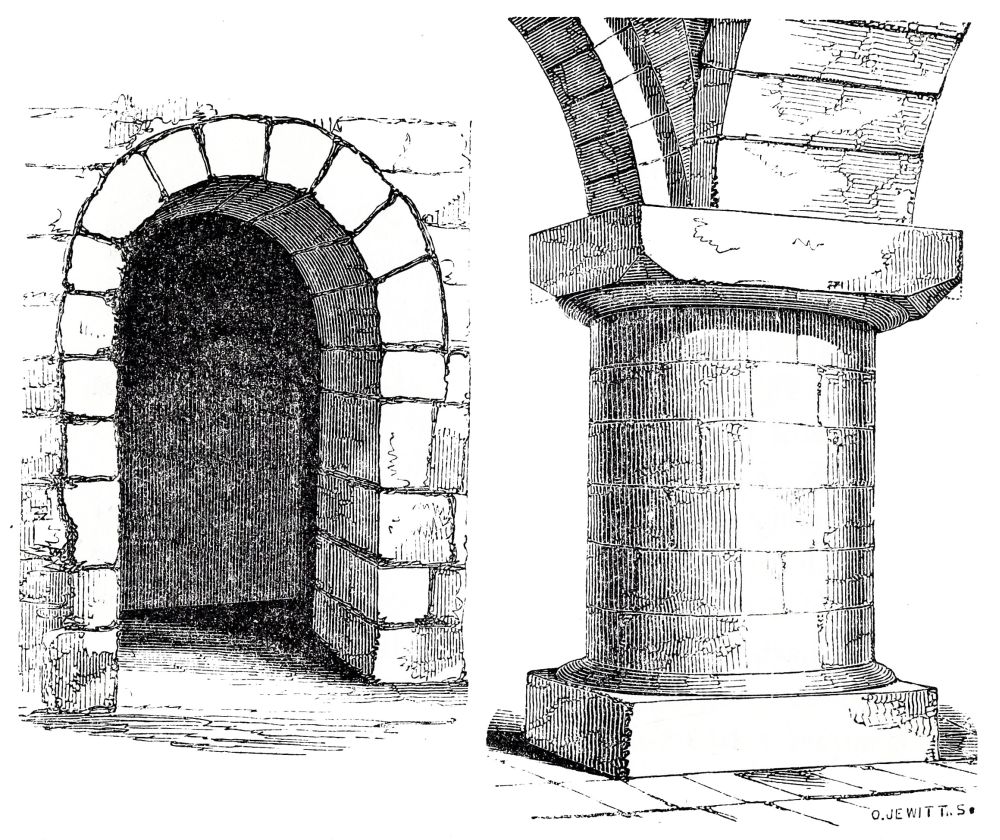 at the foot; the work is rude and clumsy Norman, with wide-jointed masonry, and the capitals left plain, to be painted or carved afterwards.