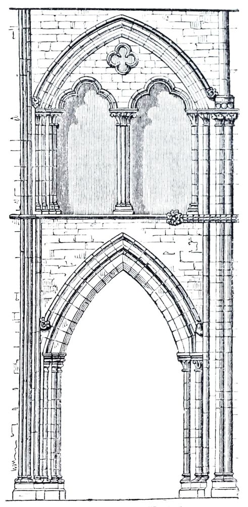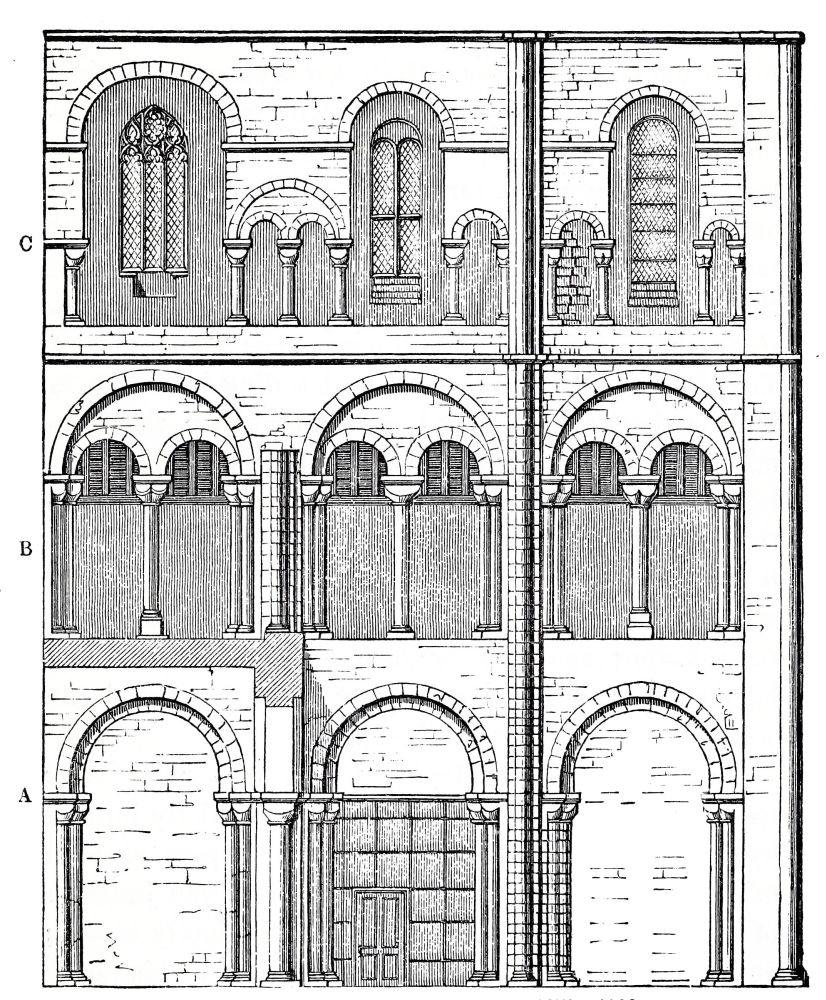 N.B. It may be noted that the pier-arches, triforium, and clerestory, are all nearly of equal height, which is frequent in Roman basilicas and in the Norman style, but not afterwards. |
