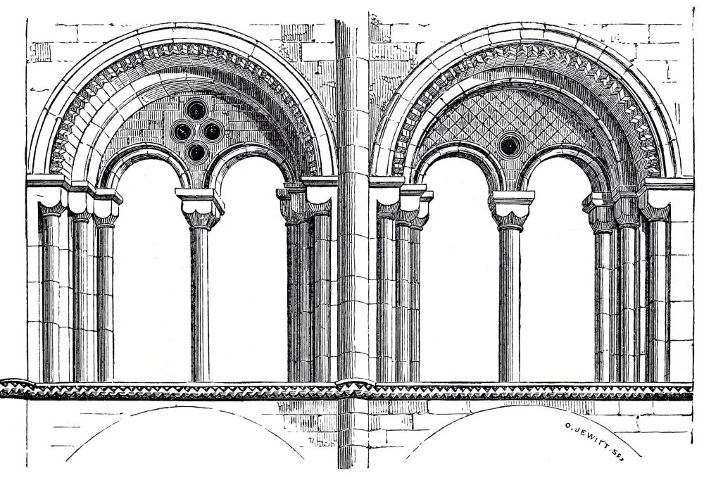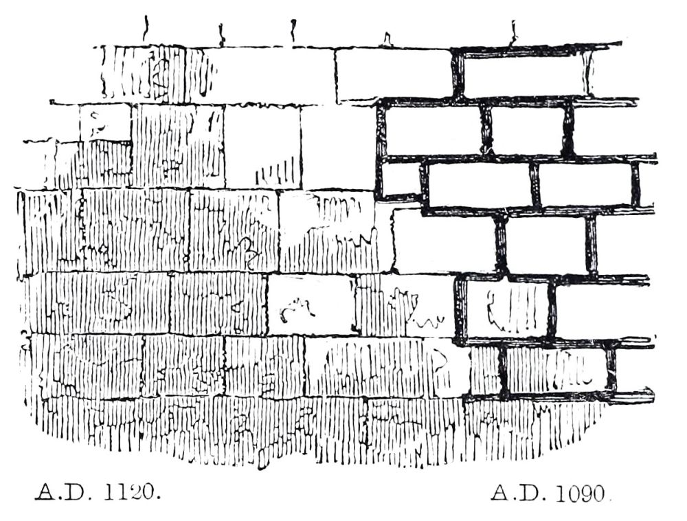 Gervase and William of Malmesbury have furnished us, as we have seen, with a clue by which to distinguish the work of the early Norman period from that of a later age, namely, wide-jointed masonry, and shallow sculpture executed chiefly with the axe instead of the chisel. The best and safest test is the wide-jointed masonry, where it is found; but in some cases the joints{40} can hardly be said to be either wide or fine; they are of a moderate width, and not of marked character either way.