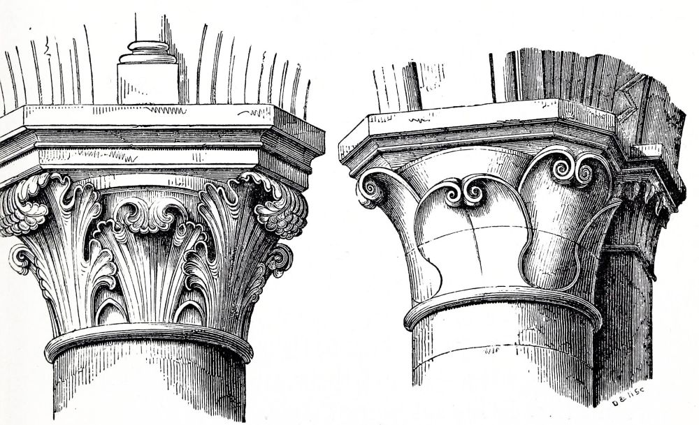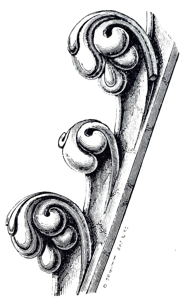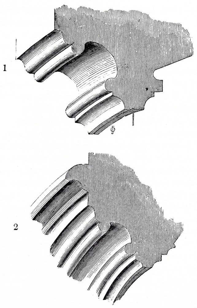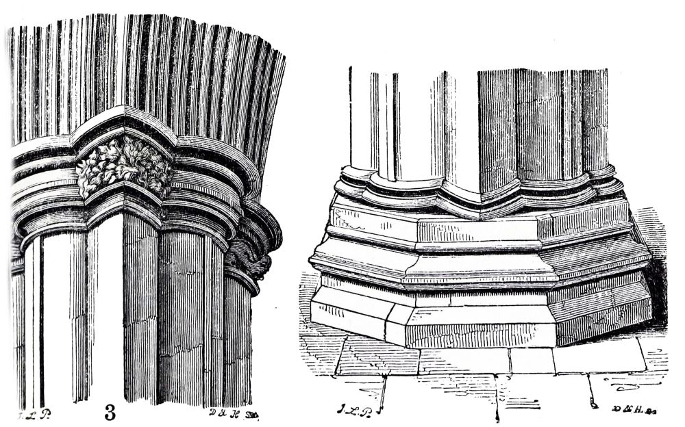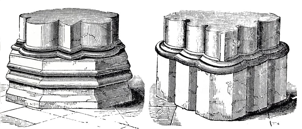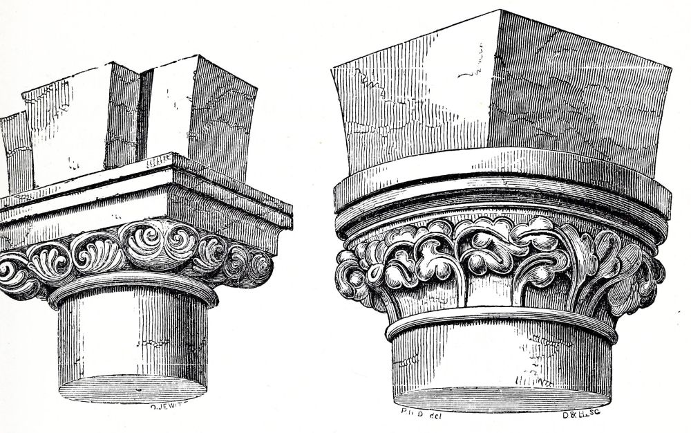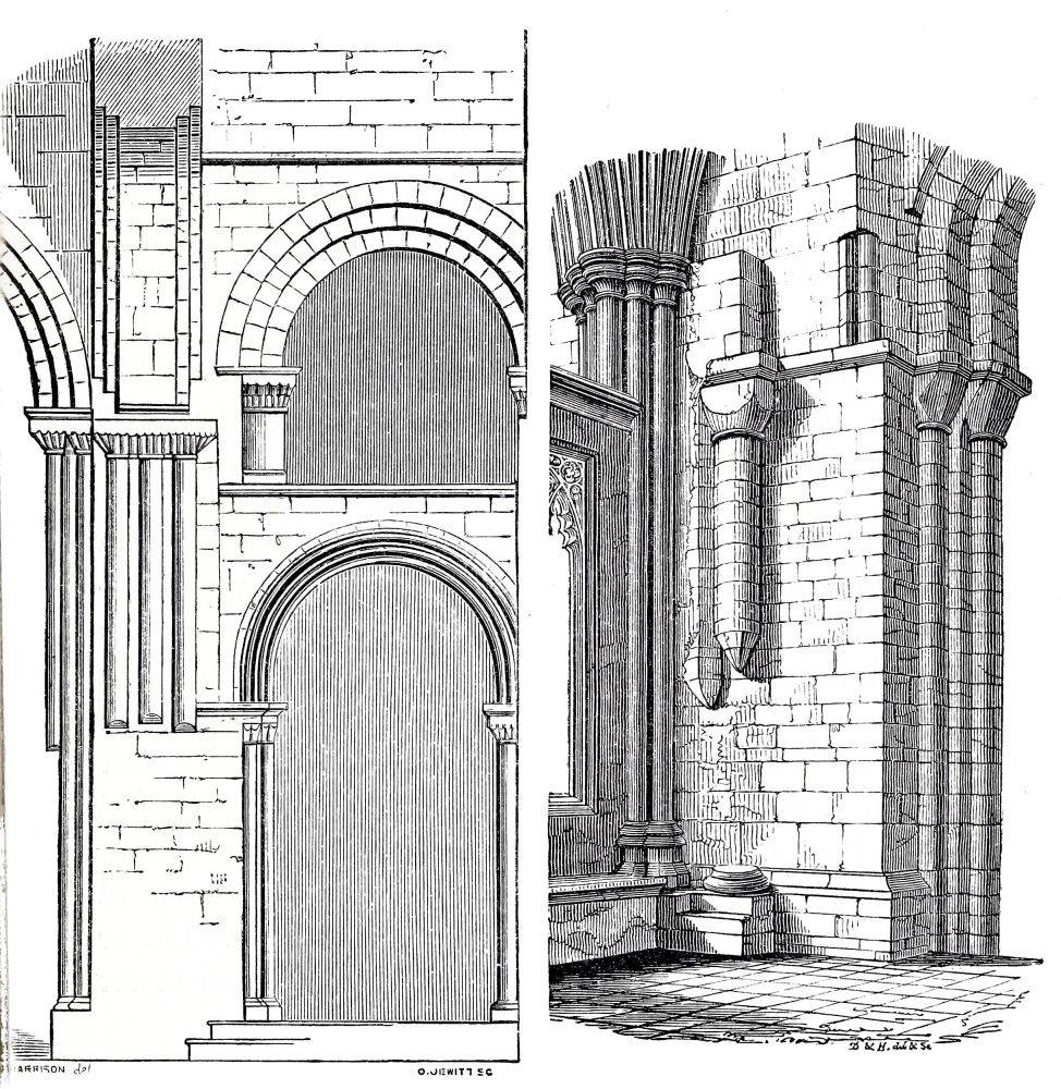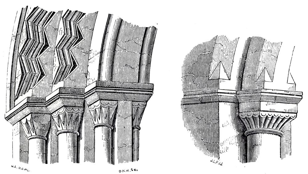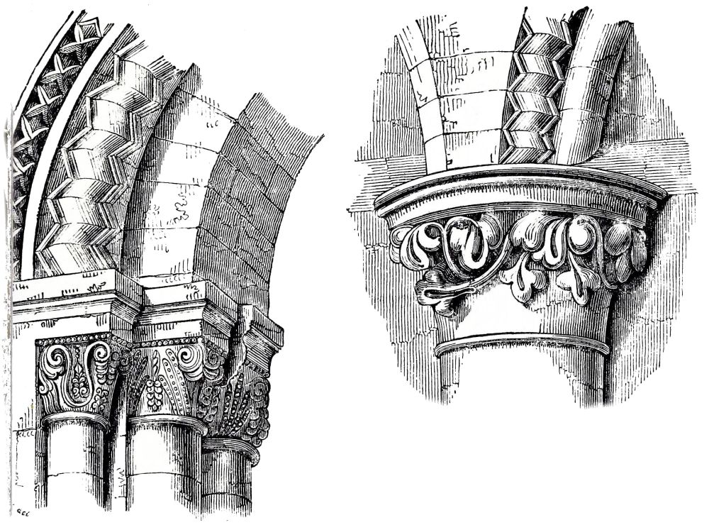 The nave and transepts of Ely were erected by Abbot Simeon, brother of Bishop Walkelyn. Part of the west front of Lincoln was built by Bishop Remi, or Remigius, 1085-1092: the small portion which remains of this work is a very valuable specimen of early Norman, the{24} more so that the insertion of later and richer Norman doorways by Bishop Alexander, about fifty years afterwards, enables us to compare early and late Norman work, while the jointing of the masonry leaves no doubt of the fact that these doorways are insertions, and therefore confirms the early date of the three lofty arches under which they are inserted. A comparison of the capitals and details of these two periods, thus placed in juxtaposition, is extremely interesting. The wide-jointing of the masonry and the shallowness of the carving distinguish the old work from the new. Several capitals of the later period are inserted in the older work, as is shewn on careful examination by the jointing of the masonry, and by the form of the capitals themselves: the earlier capitals are short, and have volutes at the angles, forming a sort of rude Ionic; the later capitals are more elongated, and have a sort of rude Corinthian, or Composite foliage.