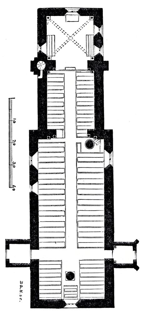 Here it may be well to mention, that down to the early Norman period the eastern limb of a cruciform church, or the chancel of a plain oblong plan, was always short, rarely more than a single square, or at the utmost two squares, in length, and was frequently terminated by a round east end called an apse. Immediately after this period the custom of lengthening the eastern limb of the church became so general, that the original dimensions have been almost lost sight of. The history of nearly every one of our cathedrals gives the same result: first, the choir was lengthened by the{39} addition of a presbytery, and afterwards still further by adding a lady-chapel, which did not come into fashion until quite the end of the twelfth century.