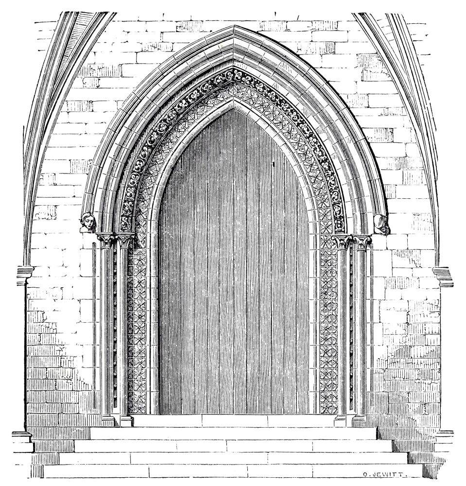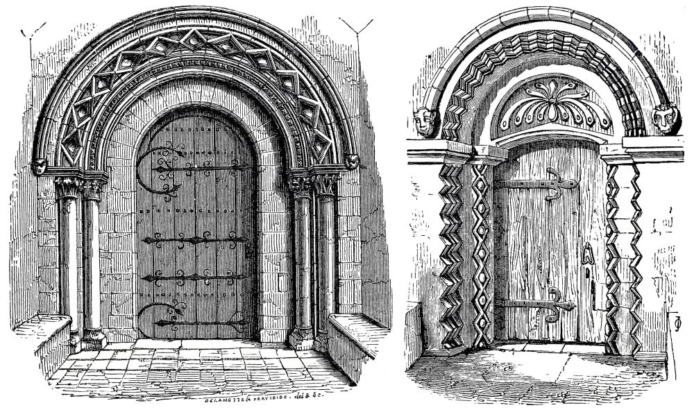 consisting chiefly of round and quarter-round members, but all preserving a general square outline. These moldings, however, as well as the jambs and shafts, are frequently entirely overlaid with ornament, which, though of a peculiar and somewhat rude character, produces great richness of effect; and few features of churches are more generally admired than these rich Norman doorways, which are very abundant in many parts of the country, quite as much so as in Normandy itself. The examples in England are quite as fine and as numerous in proportion as in Normandy; and these doorways were so much admired for their rich character, that they have often been preserved when the church has been rebuilt, perhaps several times. The doorways of Iffley Church are among the richest that we have anywhere; not only the very fine one at the west end, but the north and south doors.