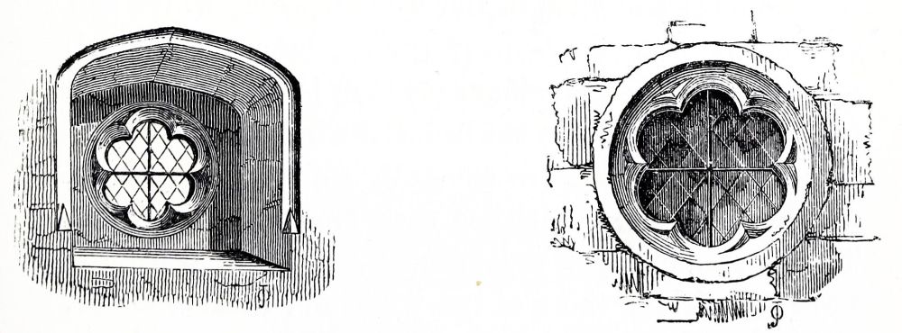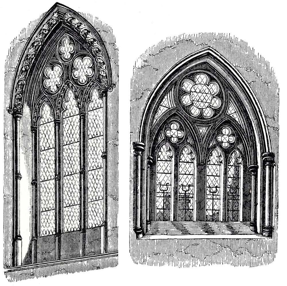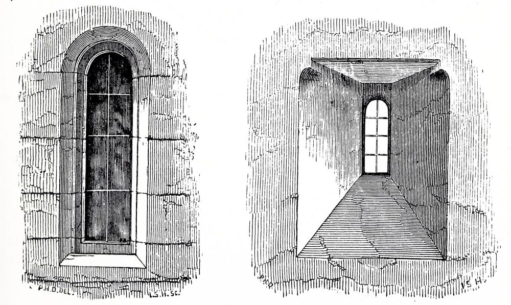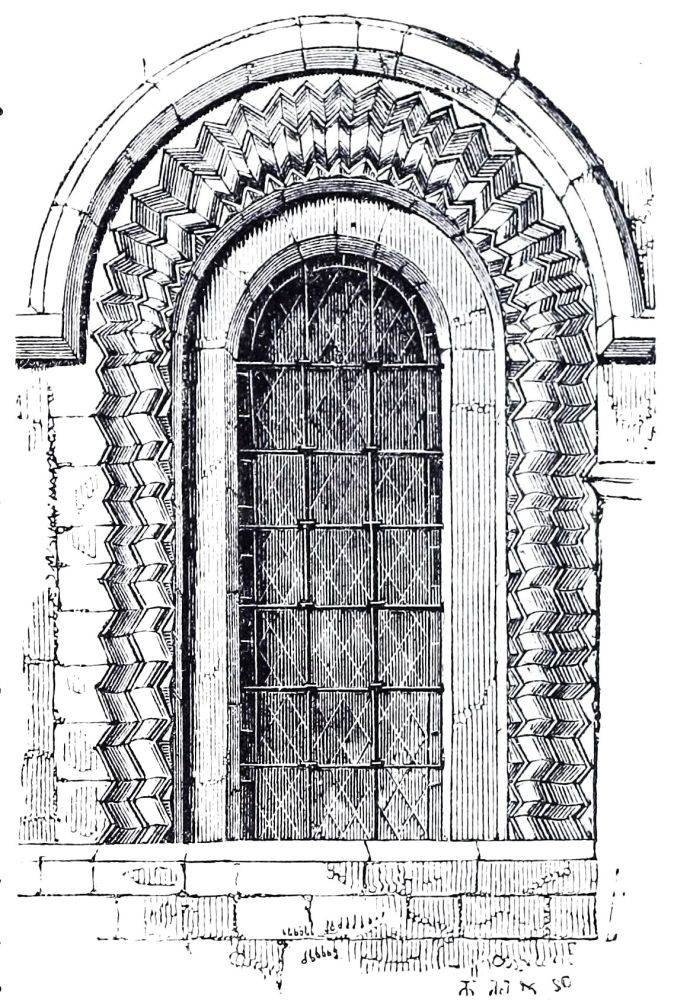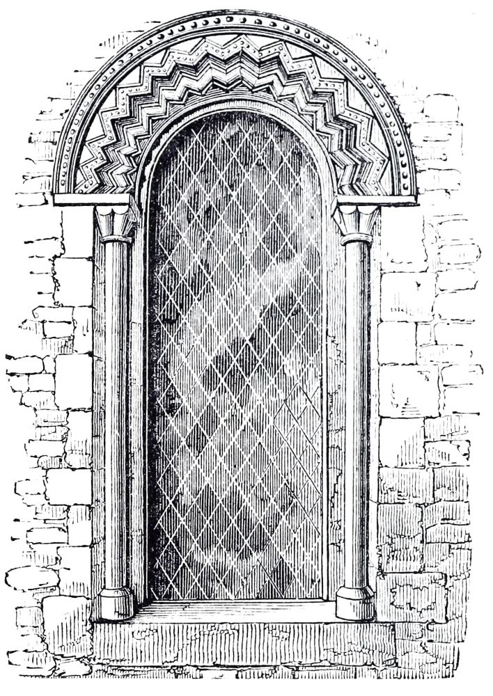 Norman Windows are in general long and rather narrow round-headed openings, but sometimes of two lights divided by a shaft, included under one arch, more especially in belfries; in rich buildings they are frequently ornamented in the same manner as the doorways, with recessed arches, zig-zag and other moldings, as at Iffley, Oxfordshire, and sometimes with sculpture; other examples have shafts in the jambs carrying the{43}