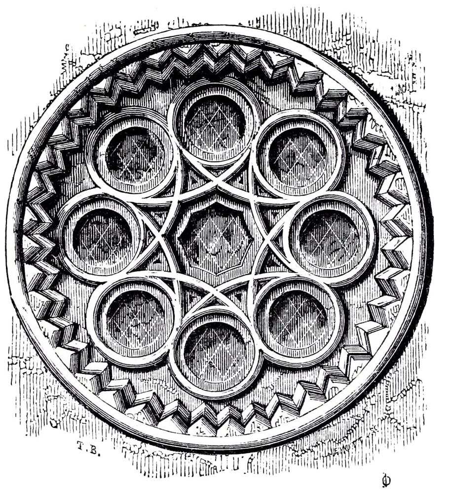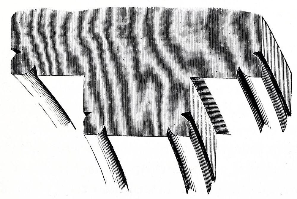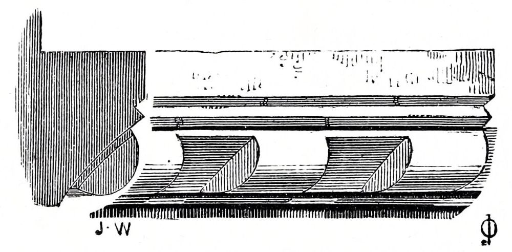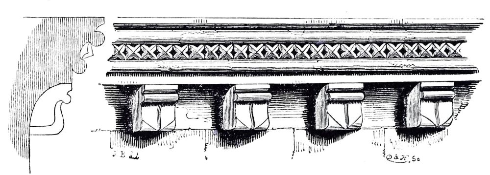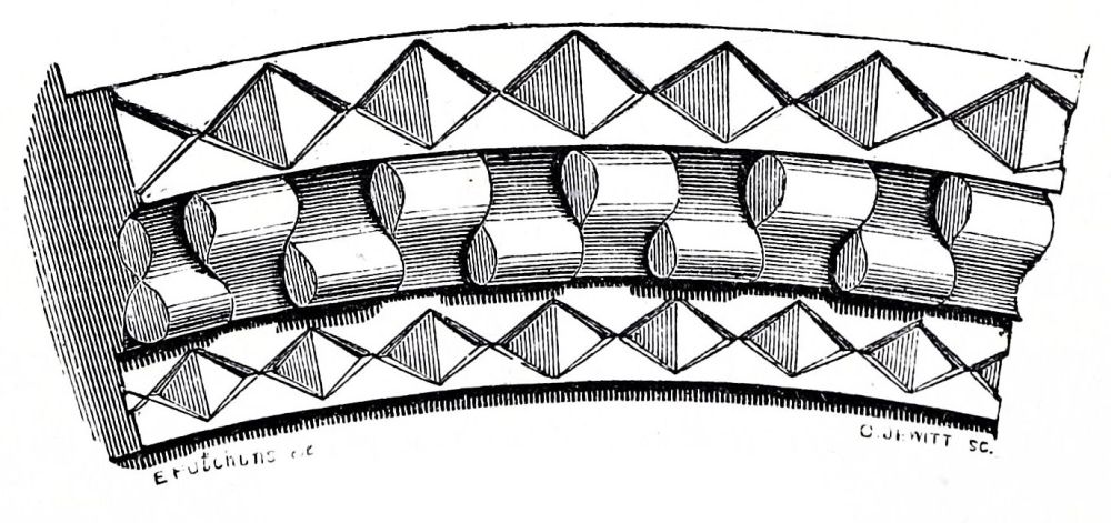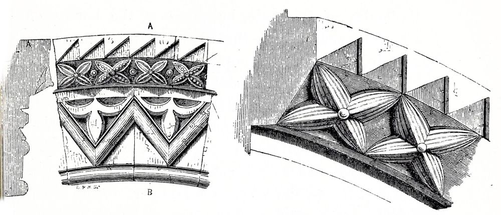 Peterborough Cathedral was begun from its foundations in 1117 by John de Seez, who formed the plan of the whole of it, which was rigidly carried out by his successors, and it was consecrated in 1143; the work is very good, but not very rich. The Norman tower at Bury St. Edmund’s was commenced in the same year, 1117, and finished in 1130; the porch is an addition{32} about half a century later. The nave of Norwich was built between 1122 and 1145: the work is still very plain, being in continuation of the previous work. Castor Church, Northamptonshire, bears an inscription recording its dedication in 1124: the tower is good, rich Norman work; the ornaments are the hatched, the square billet, and the scollop, all of very simple character, shallow, and easily worked. Furness Abbey was founded in 1127, but very little of the original work remains. In Canterbury Cathedral, the work of Prior Ernulf, under St. Anselm, was completed in 1130, and part of Rochester, where Ernulf had become bishop, in the same year; so that we need not be surprised at finding more ornament in these two cathedrals than is quite consistent with the usual character of early Norman work, and the same ornaments repeated in both these churches. St. Martin’s priory at Dover was founded in 1131; the refectory is still standing, and is a good example of plain Norman work, neither very early nor very late.
