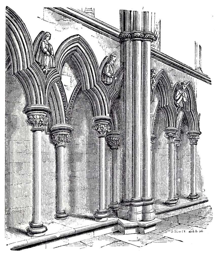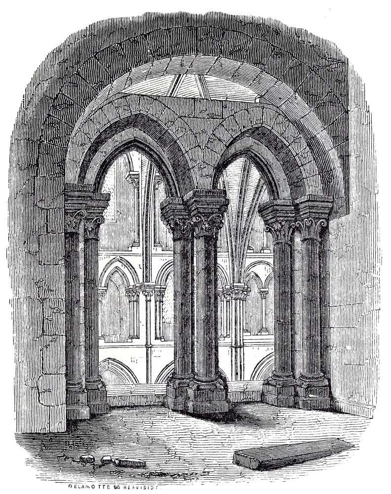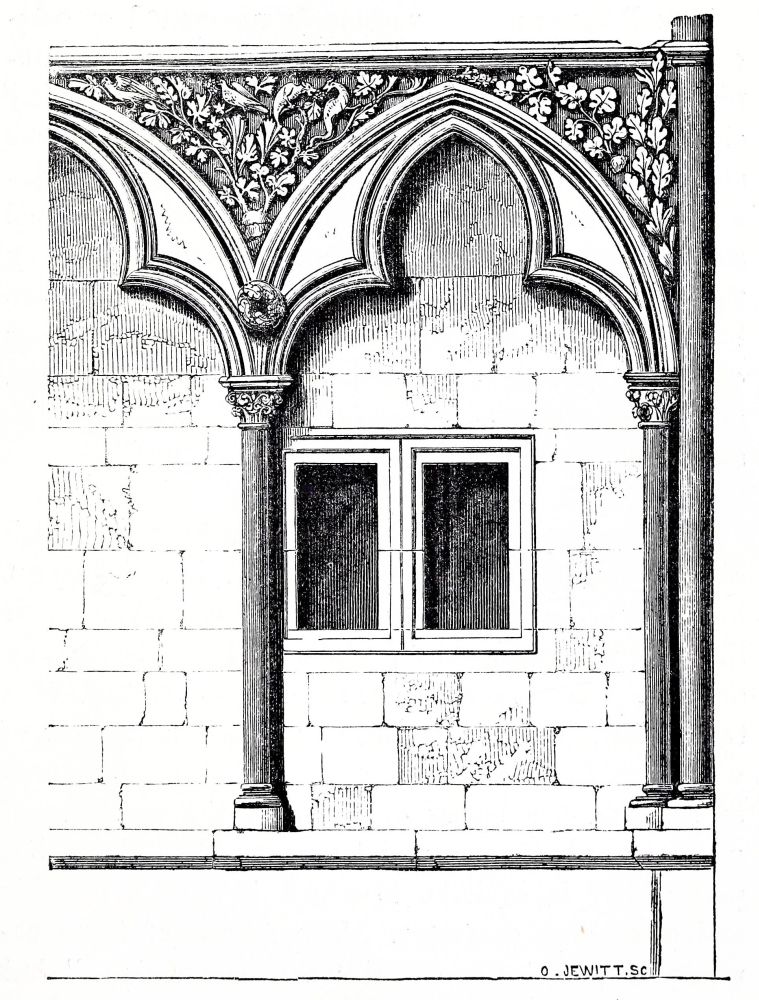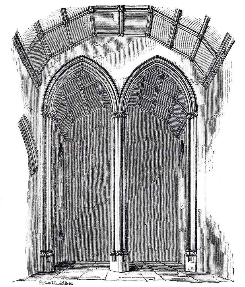 THE Norman style was introduced into England in the time of Edward the Confessor; the king himself founded the great Abbey of Westminster, and many of the buildings were begun in his time. Of this church he had completed the choir and transepts, which were sufficient for the performance of divine service, and it was then consecrated, Dec. 28, 1065, a few days only before his death. As soon as the choir of a church was ready for Divine Service, it was usual to consecrate it: the nave was called the vestibule, and was not consecrated. The nave of Westminster at that time was not built: it is probable that a nave was built in the twelfth century, but of this church we have no remains. The dormitory was in all probability building at the same time, as the monks or canons who had to perform the service in the church must have required a place to sleep in. Of this dormitory the walls and the vaulted substructure remain. The refectory also was begun at the same period, and we have the lower part of the walls, with the arcade{11}