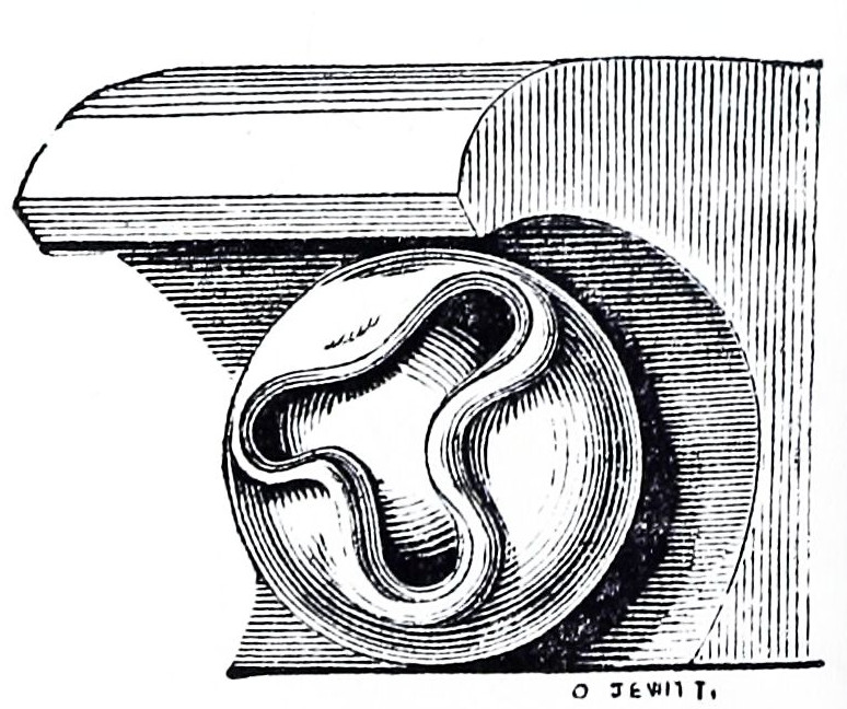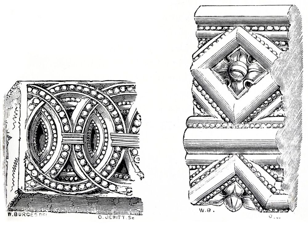 We find in early Norman work that the chisel was very little used; most of the ornaments are such as could be readily worked with the axe, and whatever sculpture there is appears to have been executed afterwards, for it was a general practice to execute sculpture after the stones were placed, as is evident in the early work at Westminster: some of the capitals in the crypt of Canterbury are only half finished to{37} this day, the work of carving having probably gone on until it was stopped by the great fire in 1174. If the sculpture is early it is very rude, and the work is shallow. But shallowness of carving depends partly on the nature of the material to be carved; from this cause buildings of a hard stone, such as granite, often appear much older than they really are. Baptismal fonts especially are frequently made of hard stone or marble, which admit of shallow sculpture; and rich Norman work cut shallow may be found as late as the time of Henry II.