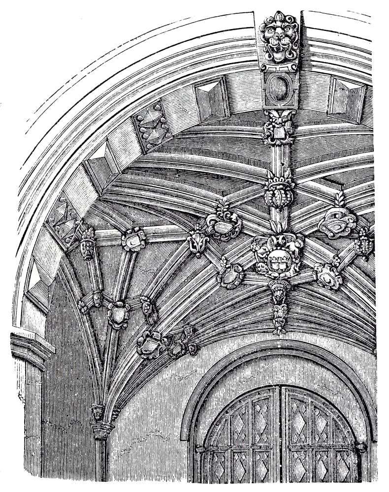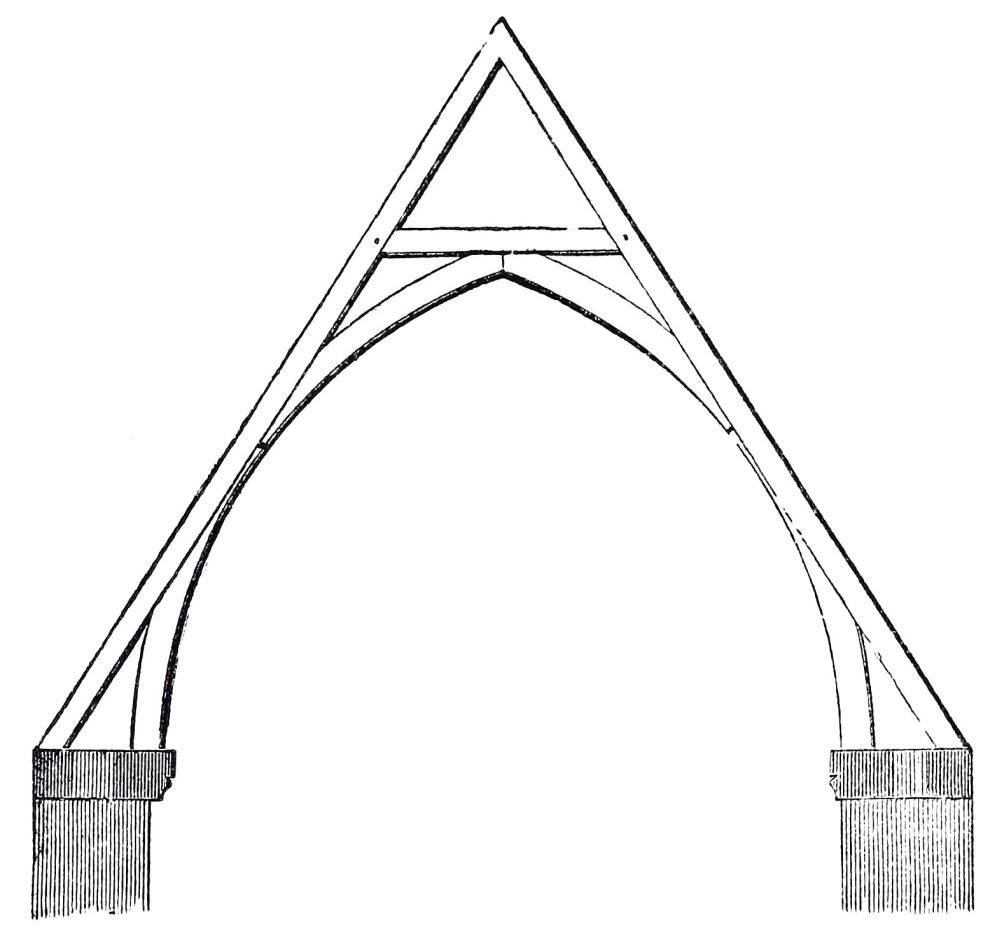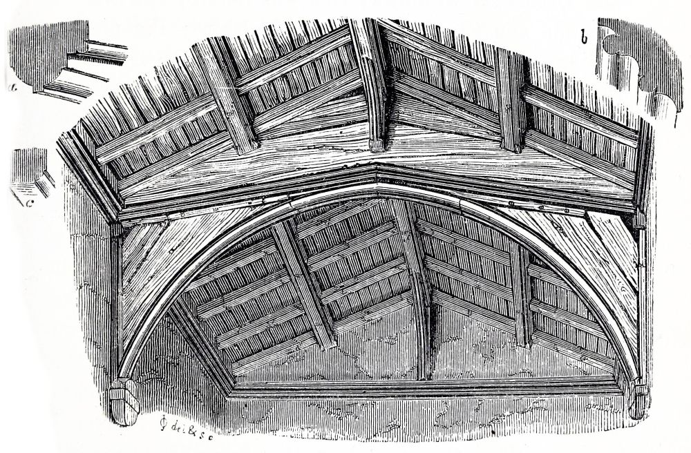 Although the roofs of the aisles at Canterbury had been vaulted, the choir itself had a flat boarded ceiling, painted like that still remaining at Peterborough. The vault of{38} the choir of the cathedral of Sens, from whence came William, the architect of the choir of Canterbury, is also an addition of later date. The same change was made in many other churches of that period. The builders of the early Norman period did not venture to erect a vault over so large a space; we do not find any early vault over a space above twenty feet wide, and few of so wide a span. Many of our Norman cathedrals still have timber roofs over the large spaces, and the aisles vaulted. In Normandy vaults were more frequently used than in England, even at this early period; and this was still more the case in subsequent times, for the fine open timber roofs for which some parts of England are distinguished are unknown in Normandy, where almost every village church is vaulted over.