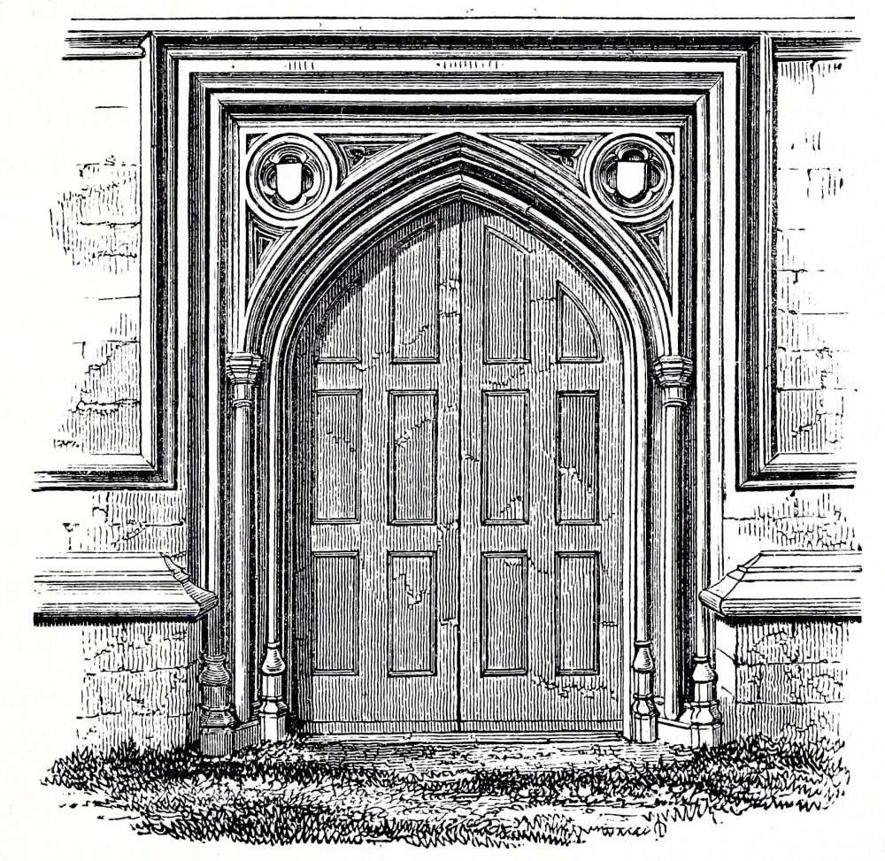 The arch is generally at first not recessed at all, afterwards only once recessed, and the edges are either square, or have a plain round molding cut upon them; the zigzag ornament is used, but not so abundantly as at a later period; the dripstone is frequently ornamented with what is called the hatched molding; the billet is also used, but sparingly, and perhaps not before 1100; it is found in the early parts of Peterborough, but not in the later parts. The head of the door is generally square with a round arch over it, and the intermediate space under the arch, called the tympanum, is either left plain, or ornamented with shallow sculpture of rude character, sometimes preserved from an earlier building.