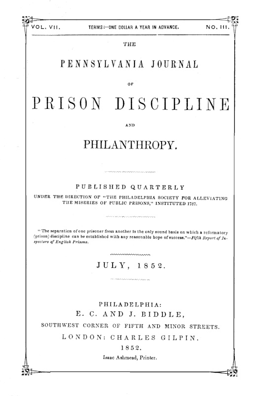 Numbers 1 and 2 of volume I. of this Journal—the first containing a Review of the History of Penal Legislation in Pennsylvania, and several plates, illustrative of prison architecture; and the second containing a beautiful steel portrait of Mrs. Elizabeth Fry, and a view of the New Prison at Pentonville, near London, and an account of its discipline and results.