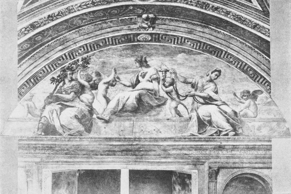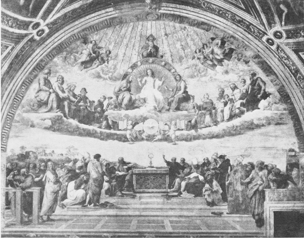 When the girl said she did not know why she liked the picture, I think she meant that she could not put into words what she felt. It was the feeling with which the picture filled her that made her like it. I could understand what she meant, because I remembered an experience of my own. The first time that I saw Raphael’s Disputá, which decorates a wall in one of the rooms of the Vatican in Rome, I had set out with my guidebook, intending to study all the{13} paintings by Raphael that decorate these rooms. I entered the first room and, I suppose, looked round the walls and saw three other paintings; but all I recall during this visit was the Disputá. I sat down before it and remained seated! I do not know how long, but the morning slipped away. What I thought about as I looked at the picture I cannot tell you. My impression is that I did not think at all; I only felt. My spirit was lifted up and purified and strengthened with happiness. Returning to my hotel, I read about the picture in the guidebook. It appeared that one of the figures represented Dante. I had not noticed it, and as I read on I found out other things that I had missed; that, indeed, the whole subject, so far as it could be put into words, had escaped me. I had no knowledge of what the painting was about; only I had felt its beauty.