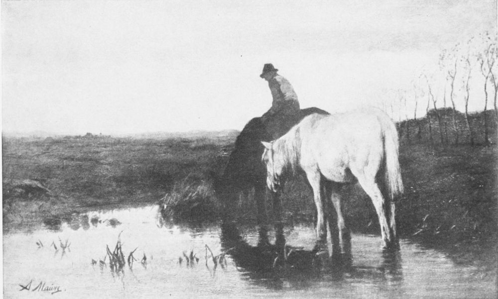 “I am sure you wouldn’t,” he goes on without waiting for an answer; “and if the farmer gave me a commission to paint his favorite prize cow, I am sure he wouldn’t be satisfied with these dabs. And I should not blame him. No, in that case I should place the cow where I could study it closely: the long, straight line of the back, the big angle of the hips, the strong-ribbed carcass, and its covering of glossy hair, the mild liquid eyes, and damp nose. These and a great deal more I should paint, if I were near the cow. But look at those cows over yonder.{28} They are a long way off, and consequently look very small. I can’t see in them the different points that I know a cow has; to my eyes from where I sit they look as I have painted them. For an artist does not paint what he knows to be there, but what he can see from here.