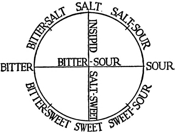 Haller enumerated twelve different qualities—stale, sweet, bitter, sour, sharp, tart, spicy, salt, urinous, putrid, spirituous, nauseating. It is evident that this classification represents only a transition step toward a psychological analysis and that it is by no means free from the suggestion of provoking substances (spirituous, putrid) and the suggestion of effects produced (nauseating).