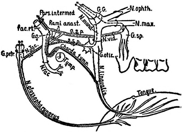 | Diagram showing some of the various courses which have been advocated for the taste fibers in man | 88 |