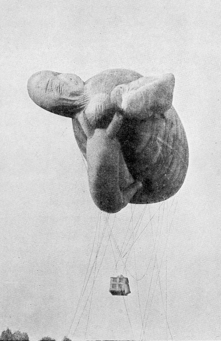 THE saucisse is a balloon shaped like a sausage—hence its name. At the front they are in the sky by the hundreds on both sides to direct the fire of the artillery and to observe the enemy’s operations generally. They are consequently made the objective of the aeroplane, and many are brought down every day. The aeroplane dodges along from cloud to cloud, and when he is just over the saucisse suddenly swoops down, and with a tic-tic-tic from his machine-gun the bag crumples up in a cloud of black smoke and flames, the observer jumps out with his parachute, and the aeroplane dashes off pursued by many shells.