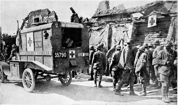 From headquarters the day’s shift is sent to the relay station, and from there cars go as needed to the postes de secours. The postes are as near the trenches as it is possible for the cars to go, and some can be visited only at night. The wounded are brought to these by the brancardiers through the boyaux, or communication trenches, and usually have their first attention here. After first aid has been administered, and when there are enough for a load, or there is a serious case, the car goes to the triage, stopping at the relay station, from which a car is sent to the poste to replace the first, which returns to the relay station directly from the hospital.