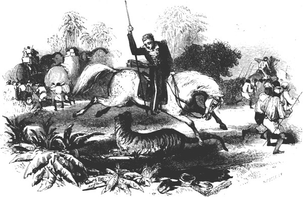 Courage is a quality of great importance in a horse, and some possess it in a high degree. It is worthy, too, of remark, that there is often something more than mere natural indifference to danger, something of an intellectual character in the courage of the horse. He learns to overcome his fears. At the sight of a tiger a horse has been known to become wholly paralysed with terror, and incapable of resistance, or even of flight; and yet this instinctive dread of mortal foes can be eradicated by education, and a reliance on the protection of man. A remarkable proof of this is, that the hunting leopard is allowed by the well-trained horse to spring on his back, either behind or before his master, when he goes a-field in pursuit of game. One of the most signal instances of courage on the part of horse and rider, and of perfect concert between both, is that recorded of the late Sir Robert Gillespie and his Arab. Sir Robert being present on the race-course of Calcutta during one of the great Hindoo festivals, when many thousands are assembled to witness all sorts of shows, was suddenly alarmed by the shrieks and commotion of the crowd. On being informed that a tiger had escaped from his keepers, he immediately called for his horse, and, with no other weapon than a boar-spear snatched from one of the by-standers, he rode to attack this formidable enemy. The tiger was probably amazed at finding himself in the middle of such a number of shrieking beings flying from him in all directions; but the moment he perceived Sir Robert, he crouched in the attitude of preparing to spring upon him; and that instant the gallant soldier passed his horse in a leap over the tiger’s back, and struck the spear through his spine. It was a feat requiring the utmost conceivable unity of purpose and movement on the part of horse and rider, almost realising for the moment the fable of the centaur. Had either swerved or wavered for a second, both had been lost. But the brave steed knew his rider. The animal was a small grey, and was afterwards sent home as a present to the Prince Regent.