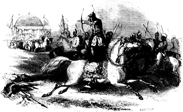 What a signal instance was given of the deep humiliation into which Imperial Rome had fallen, when a haughty Persian monarch mounted his horse from the back of the Emperor Valerian! The use of stirrups left pride and insolence without a pretext for thus degrading God’s image. Instead of offering his back to be trampled on, the servant now only held the stirrup for his lord. In the middle ages, the great were fond of exacting this token of servility from their humbled rivals: Emperors of Germany have held the stirrup for the Pope; and Henry II. of England, when his rancour against Thomas à Becket was hottest, thought to cajole the great prelate by a similar show of feigned respect.