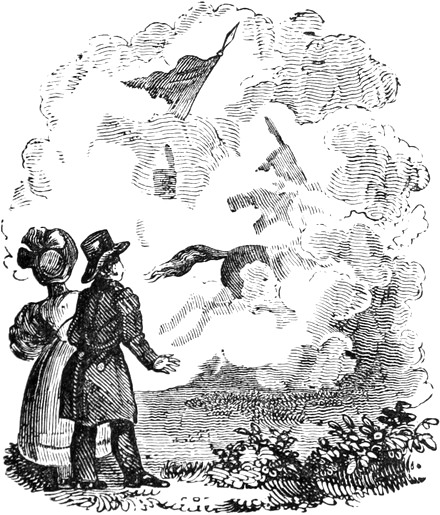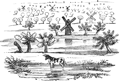 At the risk of tedium, I will attempt a cursory delineation of our rural paradise, altho’ I feel it would be morally arduous, to give any idea of the romantic scenery of the Lincolnshire Fens. Conceive, as far as the visual organ expands, an immense sequestered[Pg 5] level, abundantly irrigated with minute rivulets, and studded with tufted oaks, whilst more than a hundred windmills diversify the prospect and give a revolving animation to the scene. As for our own gardens and grounds, they are a perfect Vauxhall—excepting, of course, the rotunda, the orchestra, the company, the variegated lamps, the fire-works, and those very lofty trees. But I trust my dear Jemima will supersede topography by ocular inspection; and in the interim I send for acceptance a graphical view of the locality, shaded in Indian ink, which will suffice to convey an idea of the terrestrial verdure and celestial azure we enjoy, in lieu of the sable exhalations and architectural nigritude of the metropolis.