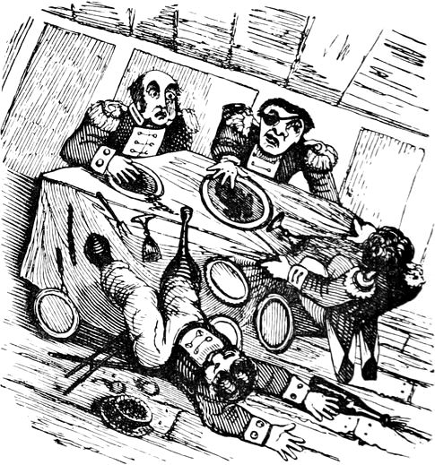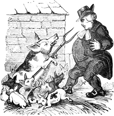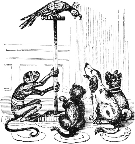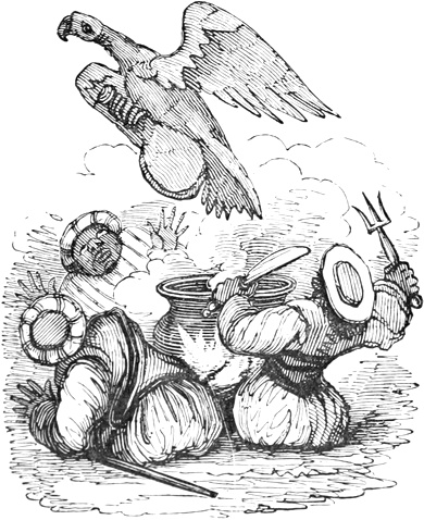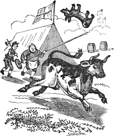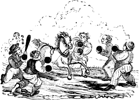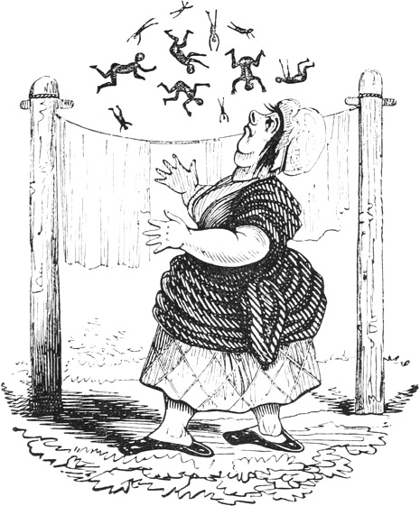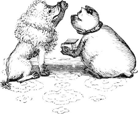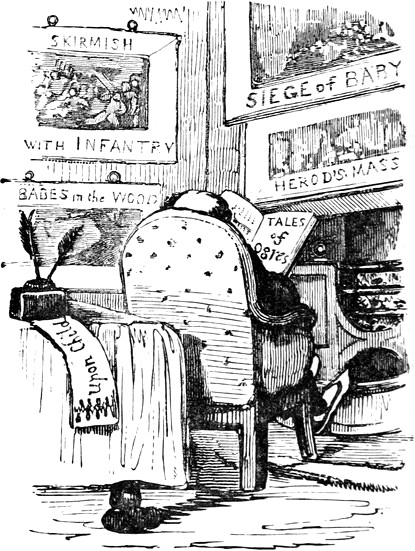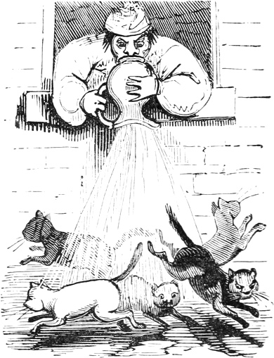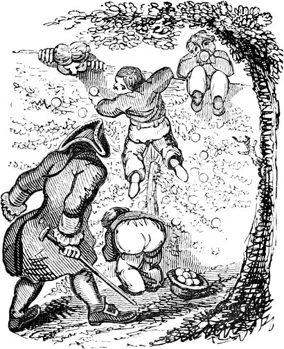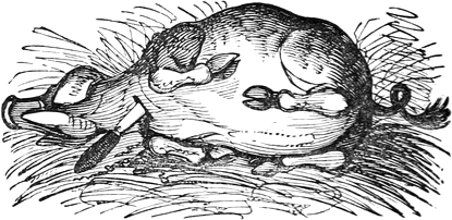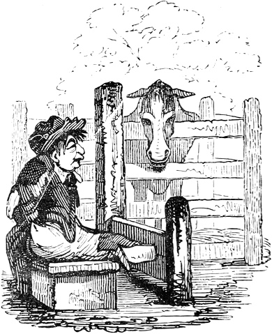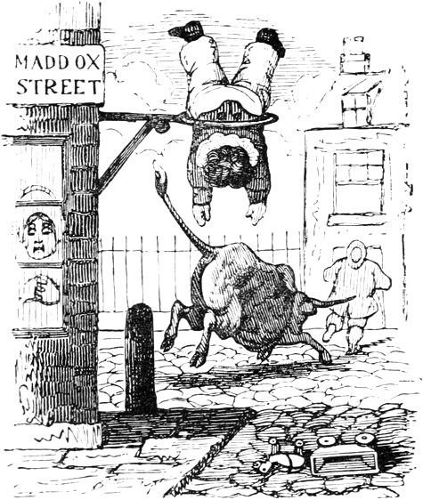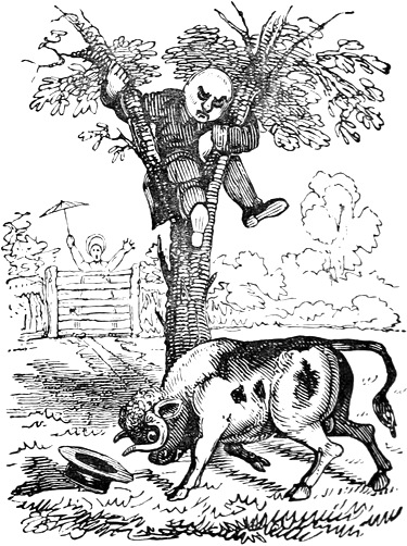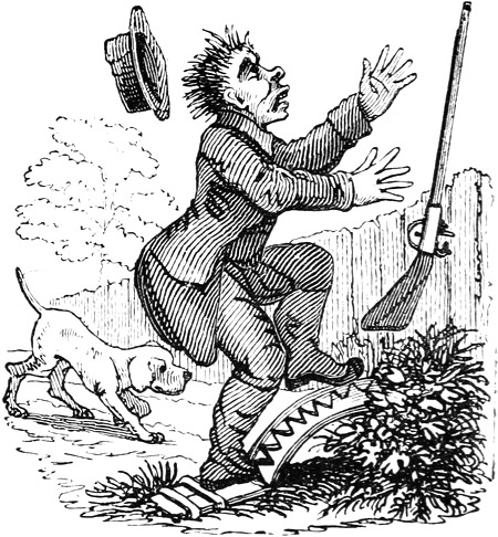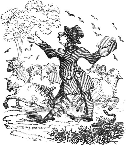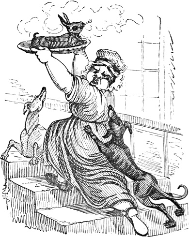 I expected to send you a quantity of wall-fruit, for preserving, and am sorry you bought the brandy beforehand, as it has all vanished in one night by picking and stealing, notwithstanding I had ten dozen of bottles broke on purpose to stick a-top of the wall. But I rather think they came over the pales, as George, who is very thoughtless, had driven in all the new tenter-hooks with the points downwards. Our apples and pears would have gone too, but luckily we heard a noise in the dark and threw brickbats out of window, that alarmed the thieves by smashing the cowcumber frames. However, I mean on Monday to make[Pg 13] sure of the orchard, by gathering the trees,—a pheasant in one’s hand is worth two cock sparrows in a bush. One comfort is, the house dog is very vicious, and won’t let any of us stir in or out after dark—indeed, nothing can be more furious, except the bull, and at me in particular. You would think he knew my inward thoughts, and that I intend to have him roasted whole when we give our grand house-warming regalia. With these particulars, I remain, with love, my dear Dorcas, your affectionate sister,