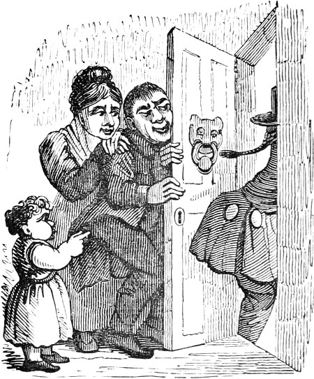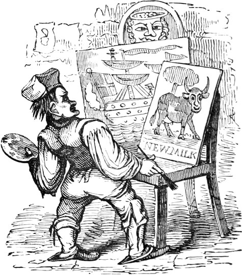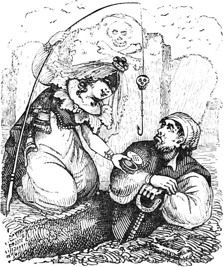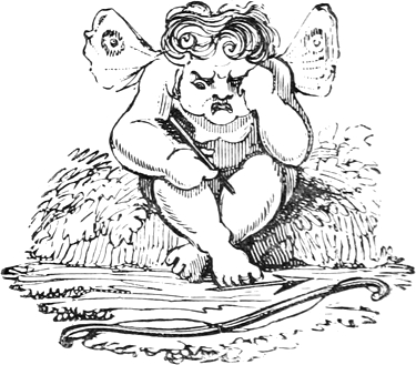 In the absence of a certain thin “blue-and-yellow” visage, and attenuated figure,—whose effigies may one day be affixed to the present work,—you will not be prepared to learn that some of the merriest effusions in the forthcoming numbers have been the relaxations of a gentleman literally enjoying bad health—the carnival, so to speak, of a personified Jour Maigre. The very fingers so aristocratically slender, that now hold the pen, hint plainly of the “ills that flesh is heir to:”—my coats have become great coats, my pantaloons are turned into trousers, and, by a worse bargain then Peter Schlemihl’s, I seem to have retained my shadow and sold my substance. In short, as happens to prematurely old port wine, I am of a bad colour with very little body. But what then? That emaciated hand still lends a hand to embody in words and sketches the creations or recreations of a Merry Fancy: those gaunt sides yet shake heartily as ever at the Grotesques and Arabesques and droll Picturesques that my Good Genius (a Pantagruelian Familiar) charitably conjures up to divert me from more sombre realities. It was the whim of a late pleasant Comedian, to[Pg x] suppose a set of spiteful imps sitting up aloft, to aggravate all his petty mundane annoyances; whereas I prefer to believe in the ministry of kindlier Elves, that “nod to me and do me courtesies.” Instead of scaring away these motes in the sunbeam, I earnestly invoke them, and bid them welcome; for the tricksy spirits make friends with the animal spirits, and do not I, like a father romping with his own urchins,—do not I forget half my cares whilst partaking in their airy gambols? Such sports are as wholesome for the mind as the other frolics for the body. For on our own treatment of that excellent Friend or terrible Enemy the Imagination, it depends whether we are to be scared and haunted by a Scratching Fanny, or tended by an affectionate Invisible Girl—like an unknown love, blessing us with “favours secret, sweet, and precious,” and fondly stealing us from this worky-day world to a sunny sphere of her own.