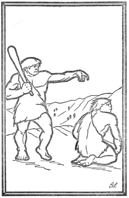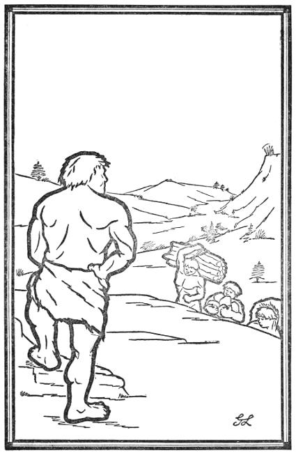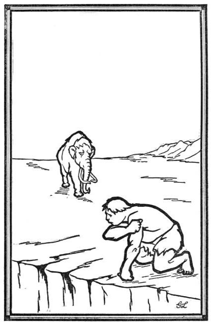 At sunrise the next day, he stood at the cave-mouth[7] fully equipped for his perilous undertaking. He warmed himself by the fire which burned at the threshold. This was to be the last time he did so for many a long day. Fire meant health and comfort; more than that, frequently it was all that stood between the cave-men and death. Men treasured it even more than they did their lives. Gonch was now leaving his one and only true friend: the fire that blazed upon the cave-hearth.