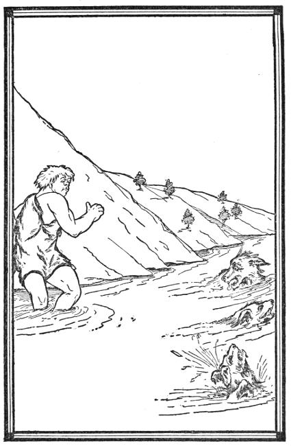 A fortnight of incessant plodding brought him to a broad pass running through the Cantabrians from north to south. A river flowed through it to the Gascon Gulf. As he stood upon the bank of this river, his sharp ears caught the sound of distant[10] howls coming from behind him. Far away he saw a group of animals, mere specks racing over the hills and after him full cry. Fastening his hide and weapons about his shoulders in a pack so as to leave his arms free, Gonch waded into the river and swam across. On nearing the eastern shore, he made no effort to continue his flight, not even attempting a landing but remaining in the water which reached to above his knees. Here he rid himself of his spear and hide, tossing them to the bank above his head. Thus free of all encumbrance except his ax, he rested and made ready to defend himself.