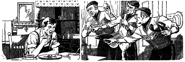 Sure enough, one bleak November morning, when I was half through a couple of eggs and a cup of coffee, I heard the throb of a motor. I walked down to the end of my wharf and looked skyward. I was pretty sure they wouldn't come by land, because most of the secondary roads were in bad shape; and they wouldn't travel by water, because that took too much gas and time. In fact, the WFI never wasted anything. They couldn't afford to. Everything went for food, its growth, collection, and processing. The big freighters, some of them, had atomic piles, but that power was impossibly clumsy and expensive for smaller boats. So they came by air in the usual inspection helicopter. The pilot dropped her in the cove right alongside the wharf and made fast. Three men stepped onto the planks. They had the wheat sheaf insignia of the WFI on their overcoat arms and caps, and they looked cold and bored. A small sea sucked at the pilings and the helicopter rose and fell, grating against the wharf. I looked at the pilot and said, "Better put your chafing gear out if you intend staying a while." We all watched while the pilot put a few kapoks at the tight spots. Then he looked at a notebook and said, "You George Arthur Henry?"