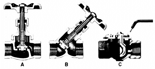 After extended use and several repairs, some valves will no longer give tight shutoff and must be replaced. When this becomes necessary, it may be advisable to upgrade the quality with equipment having better flow characteristics and longer-life design and materials. In some cases, ball valves will deliver more water than globe valves. Some globe valves deliver more flow than others for identical pipe sizes. Y-pattern globe valves, in straight runs of pipe, have better flow characteristics than straight stop valves. Figure 2 shows the features of different types of valves.