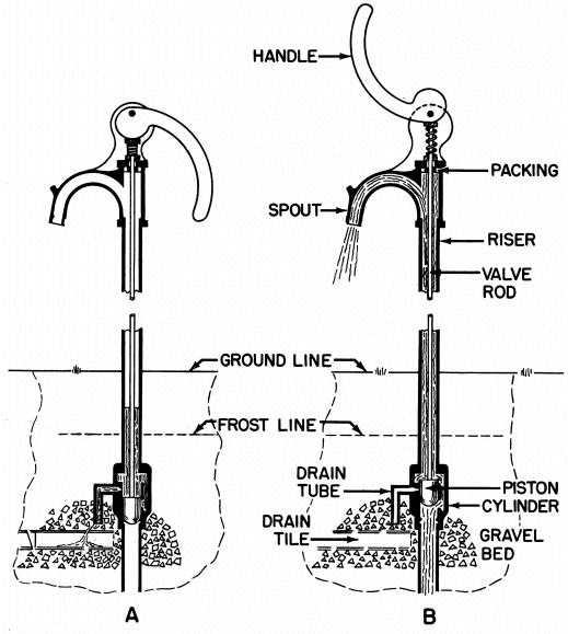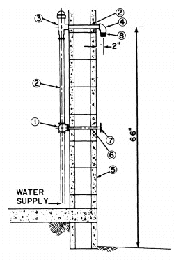 Figure 3 shows one type of frostproof hydrant. It works as follows: When the handle is raised, the piston rises, opening the valve. Water flows from the supply pipe into the cylinder, up « 5 » through the riser, and out the spout. When the handle is pushed down, the piston goes down, closing the valve and stopping the flow of water. Water left in the hydrant flows out the drain tube into a small gravel-filled dry well or drain pit.