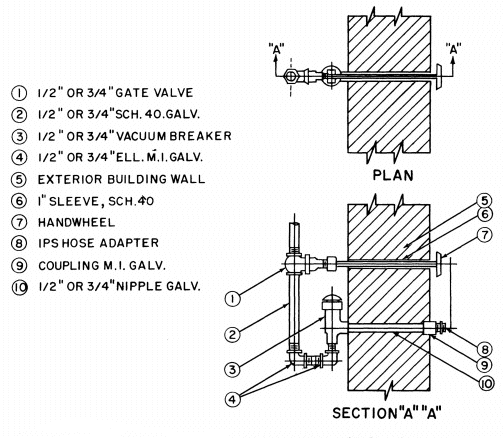Frostproof wall hydrants (fig. 4) are the preferred type. For servicing sprayers using hazardous chemicals, hydrants having backflow protection should be used (fig. 5).