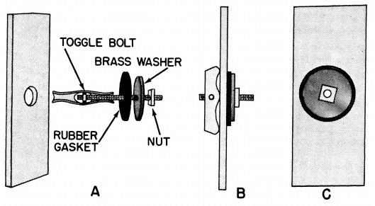 A leak can be temporarily repaired with a toggle bolt, rubber gasket, and brass washer, as shown in figure 6. You may have to drill or ream the hole larger to insert the toggle bolt. Draw the bolt up tight to compress the rubber gasket against the tank wall.