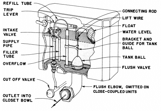 Figure 7 shows a common type of flushing mechanism. Parts that usually require repair are the flush valve, the intake (float) valve, and the float ball.