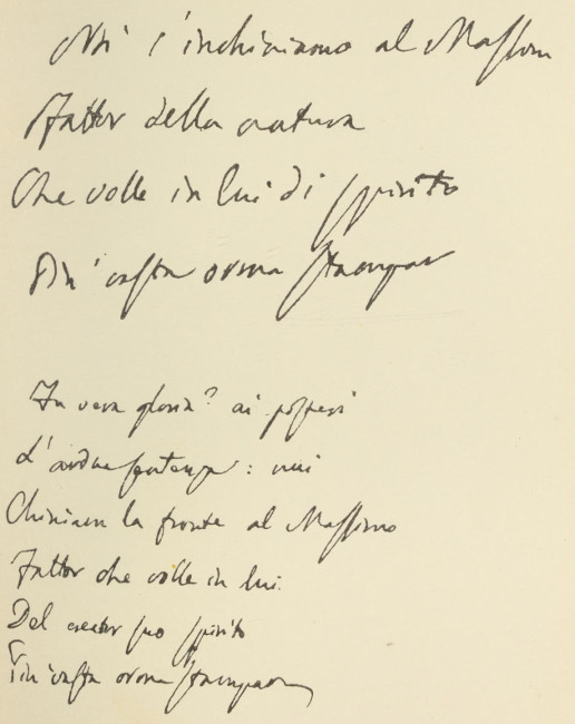 Stile pazzesco. — È stato notato l'uso della continua ripetizione delle stesse lettere, delle stesse frasi (De Lollis, Raccolta, vol. II). Harrisse nota che nel Libro delle Profezie settantacinque linee sono rimate; ed è notorio l'abuso della rima negli scritti dei paranoici (Vedi Uomo di genio, 6. ed., Torino, 1896). Ma il fenomeno più caratteristico del paranoico si raccoglie dalla firma, che egli usò dal 1494 in poi, come si vede nei numeri 2 e 4: