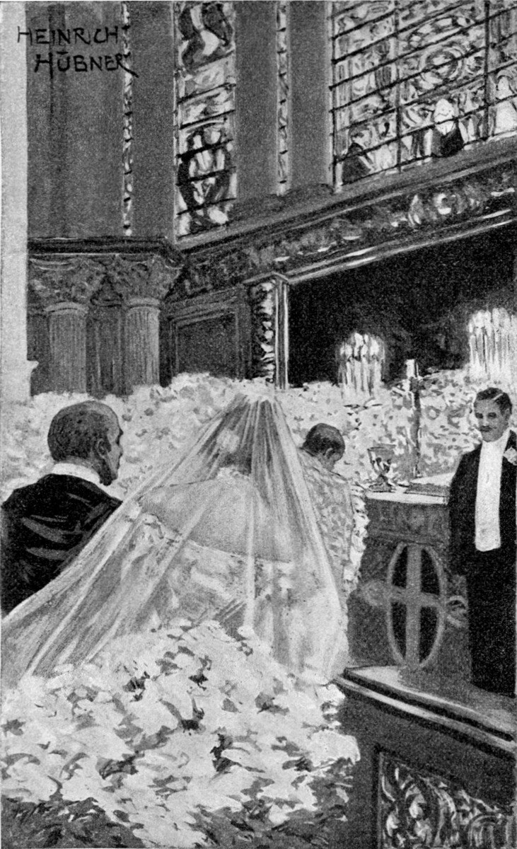 Auf einmal schwieg das leise Stimmengesumme, zu den Klängen des Lohengrin’schen Brautmarsches (!) zog feierlich der weißgekleidete Kirchenchor, die Geistlichkeit und der Bischof in vollem Ornat herein. Dann erschien im Spitzenschleier und reichem Diamantschmuck die niedliche, von ihrem Vater geführte Braut. Zwei in rosa Sammet gekleidete Pagen trugen ihre Schleppe, dann folgten paarweis schreitende Brautjungfern, Alle gleich, in irgend etwas Hellgelbem gekleidet und mit Marschallnielrosen in den Händen. Es gab keine Predigt, aber eine feierliche, wenn auch hier und da etwas sehr mittelalterlich deutliche Liturgie. Die Rührung war mäßig, Thränen sind wohl altmodisch; nur einmal, als die Braut mit zitternder Stimme nachsprach, „bis daß der Tod uns scheide,“ wurden einige Matronen sichtlich ergriffen. Zum Schluß wurde, wie bei uns, die junge Frau ziemlich allseitig abgeküßt, und dann begab sich Alles zur Lady Carleton, wo großer Nachmittagsempfang stattfand. Die Braut zerschnitt einen monumentalen, kunstvollen Hochzeitskuchen, man trank herben Sect, aß Treibhauspfirsiche und bewunderte die nach unseren Begriffen unglaublich zahlreichen und kostbaren Hochzeitsgeschenke. Zwei Cousinen erzählten sich, daß „die arme Mabel“ ganz[S. 19] trostlos über ihre achtundzwanzig silbernen Sahnentöpfchen und fünfundvierzig Armbänder sei und berathschlagten, wie man diesen Ueberfluß am zweckmäßigsten verwenden könne. Das eine junge Mädchen war bildhübsch: blond, zart und mit einem süßen, etwas kecken Profil. Auch erwies sie sich ganz gnädig, und ich klettete mich an sie, bis Hoyen mich zur Abfahrt des Paares fortholte. Alle jüngeren Damen und Herren drängten sich bis an den „Square“ herein, die Hausthüre umstanden sämmtliche Brautjungfern — ein hübsches Bild — und als die jungen Eheleute vergnügt und strahlend fortfuhren, bewarf man sie mit einem Regen von Reiskörnern und einigen weißen, seidenen Schühchen.