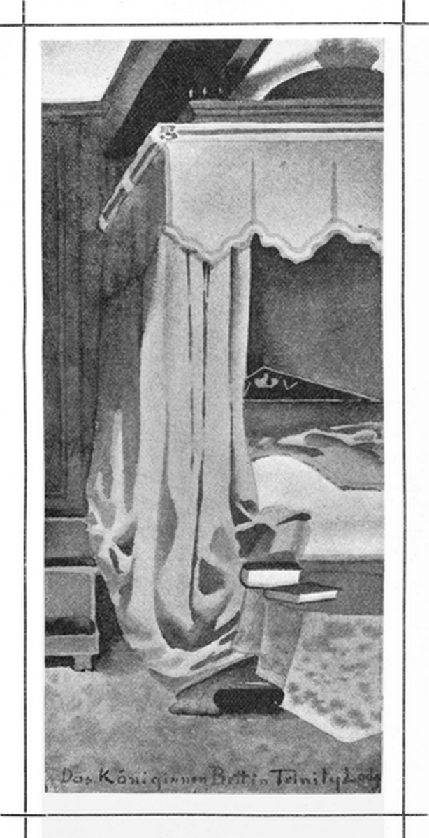 Ich habe aber fast einen Schreibkrampf bekommen und höre auf. Den prächtigen Bibliotheksaal, in dem Addison dichtete, habe ich vergessen. Besonders schön ist auch der „goldene Ballsaal“ mit modernen Fresken von Watts, der in diesem Hause seine frühesten Gönner fand. Sonst hat er sich wenig verändert, seitdem anläßlich der Vermählung Karls des Ersten und der Henrietta Maria der erste Ball darin gegeben wurde. Jede Generation hat hier seither getanzt und wie[S. 41] viele Hunderte noch ungeborener Menschen werden sich wohl noch auf diesen dunkeln, glatten Eichendielen ergehen!