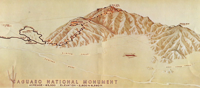 The Tanque Verde (green tank) and Rincon (inside corner) Mountains are an important part of Saguaro National Monument. This is presently the “back country” of the monument. The mountainous section has a wide variety of interests in the field of biology. The range of climates and life zones combine to make one of the most interesting stories to be found in any of your national parks or monuments.