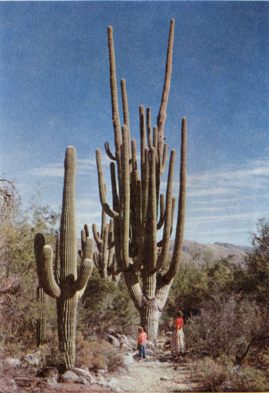 The associations of the Saguaro with other plants of the desert have not as yet been fully studied. However, it is apparent that for the first years of its life the young Saguaro seedling requires the protection furnished by a shrub or tree. Here it makes slow but steady progress until at 50 years of age it may be 10 to 12 feet tall. During the next century it may attain a height of 40 feet and a weight of several tons, dwarfing its protector of former years.